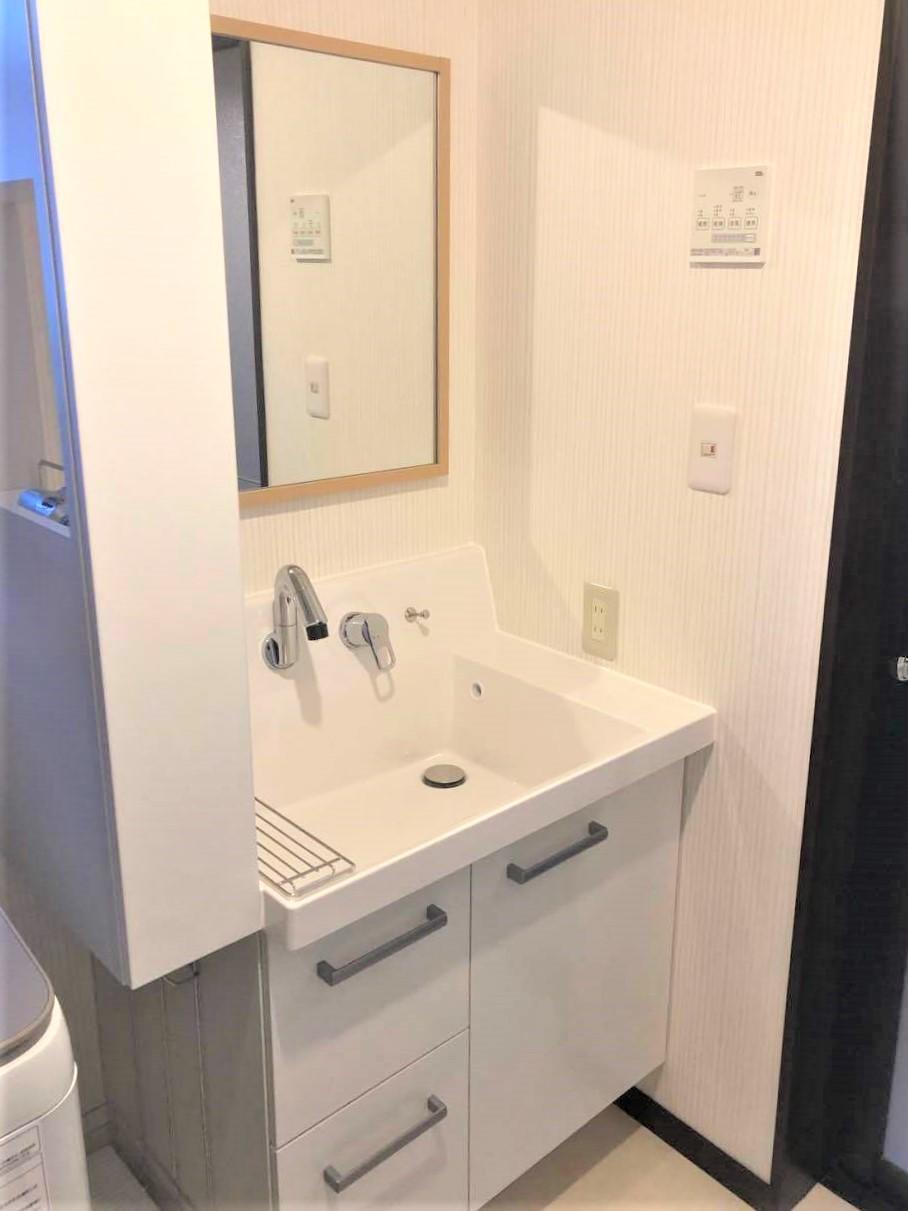 洗面化粧台はLIXILの『ピアラ』をご採用いただきました。ピアラの使いやすさのポイントは洗面ボウルと水栓にあります。「ひろびろボウル」は、底面が広く平らで大容量だからバケツの水くみや衣類のつけ置き洗いもしやすく、排水口を右奥に配置しているので作業の邪魔になりません。「くるくる水栓」は、左右に180度回転し使いたい位置にくるりと回すことができ、2人並んでの身支度もしやすいです。「新てまなし排水口」は、金属フランジ・排水口奥の凹凸をなくしたなめらかな形状の大口排水口に、スムーズに通水させるななめ形状のヘアキャッチャーでお掃除が簡単に!家事がラクになり、キレイが長続きします。洗面室の天井・壁のクロス、床のクッションフロアの貼替も行いました。クロスや洗面化粧台の扉にホワイトを選択し、お顔映りも明るくなり身支度も楽しくなります♪