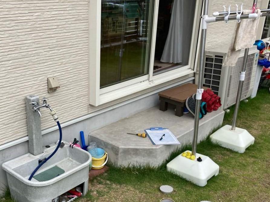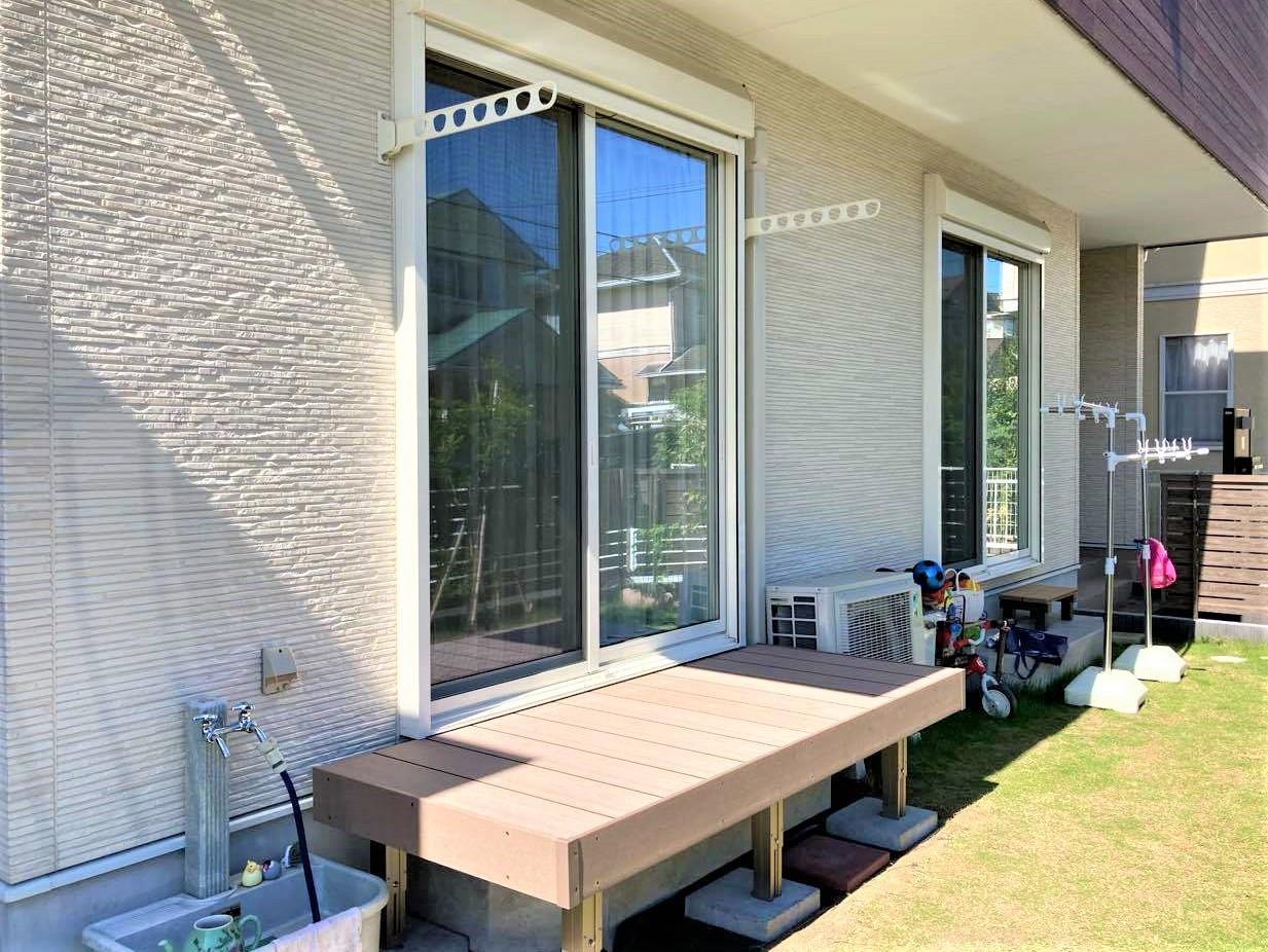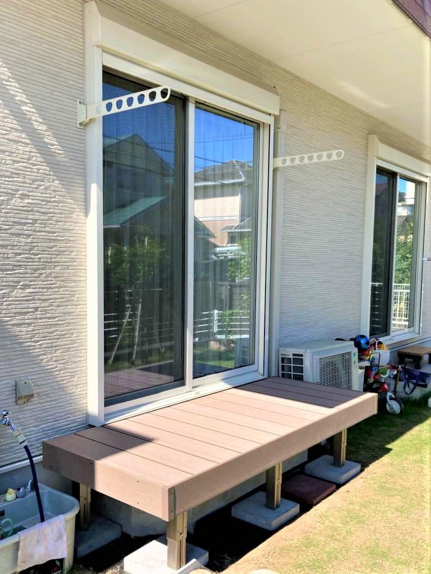 ウッドデッキはLIXILの『樹ら楽ステージ』をご採用いただきました。『樹ら楽ステージ』は、多彩なプランと豊富なバリエーションで、ガーデンスペースが思いのままアレンジできます。室内のインテリアに調和するデザイン、敷地に合わせてフレキシブルに設置できる設置対応力、樹脂製デッキ材で木特有のささくれが出にくく塗装の必要もありません。末永く楽しくご使用いただけるウッドデッキの定番です!工事前はお庭に物干しスタンドを置いて使用していましたが、壁付物干し金具を取り付けました。お庭まで出なくても、室内から干したり取り込んだりできるので洗濯物が楽になります。