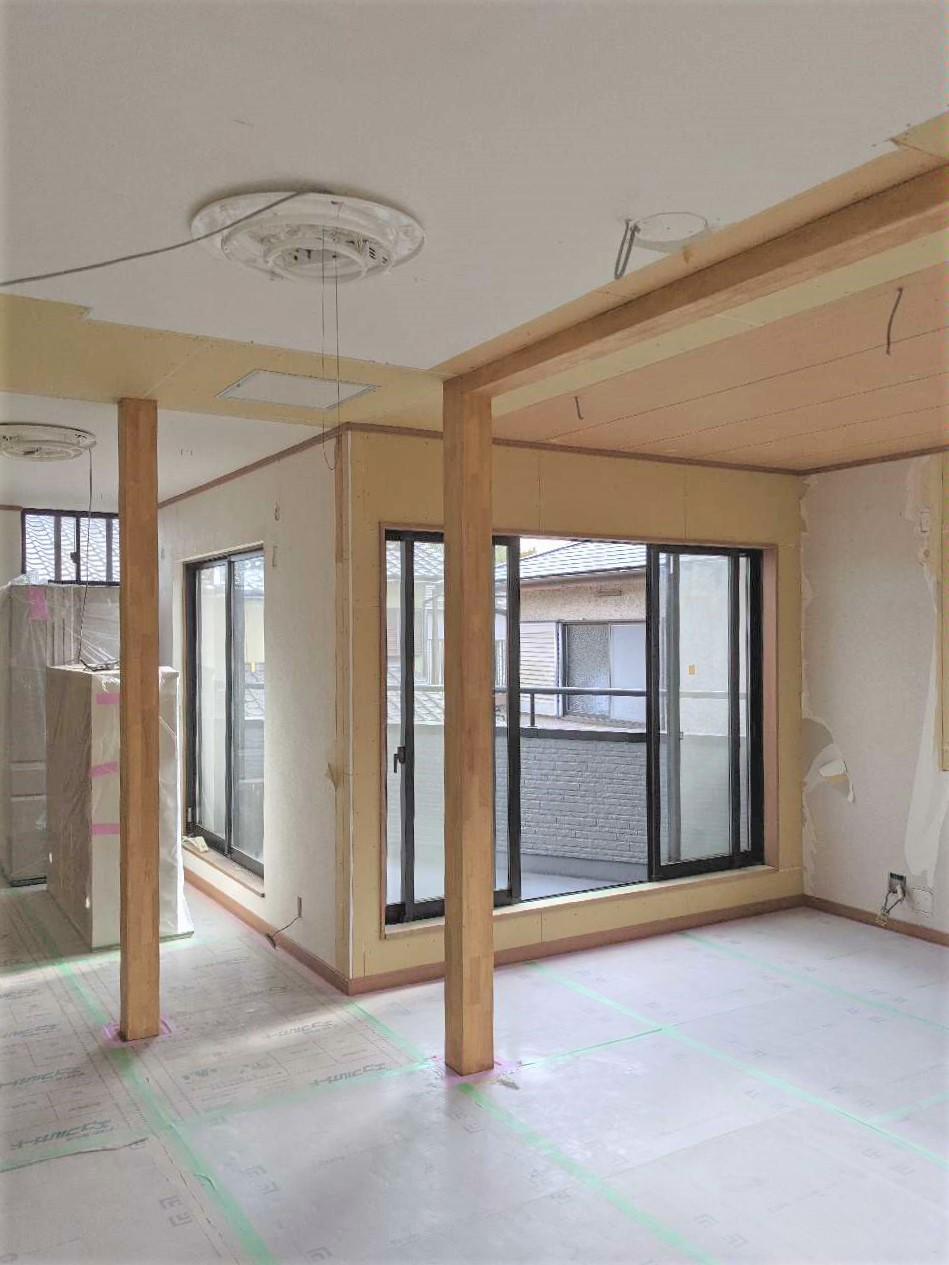 間取り変更工事にあたり、構造上どうしても撤去できない柱が2本あったため、そのまま残して見せる柱にしました。既存の柱に集成材を巻いて、オーナー様の希望の色で塗装しました。更に、柱を撤去したことによる耐震上の強度を保つため、既存の梁とは別に梁を新設して補強します。