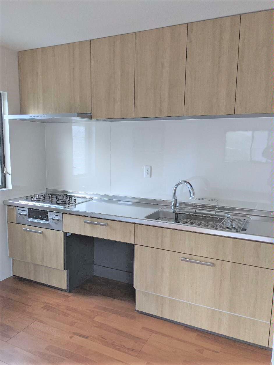 対面キッチンから壁付けキッチンに変更してLDK空間への圧迫感がなくなりました。キッチンは、LIXILのシステムキッチン『リシェルSI』をご採用いただきました。「Wサポートシンク」は使い勝手を追求した2つのレーンとシンクサポートを組み合わせて調理も後片付けもダブルでサポートします。「ハンズフリー水栓」は、吐水口に内蔵されたセンサーが物や手の位置と動きを感知して、吐水も止水も自動で行います。手を触れずに操作できるから水栓まわりがキレイに保つことができ、水の出しっぱなしも防げるから節水もできる水栓です。「らくパッと収納」は、テコの原理を応用して引出しを軽い力で開けることができます。中はよく使うものほど取り出しやすい立体構造なので取り出しやすく、しまいやすい収納です。