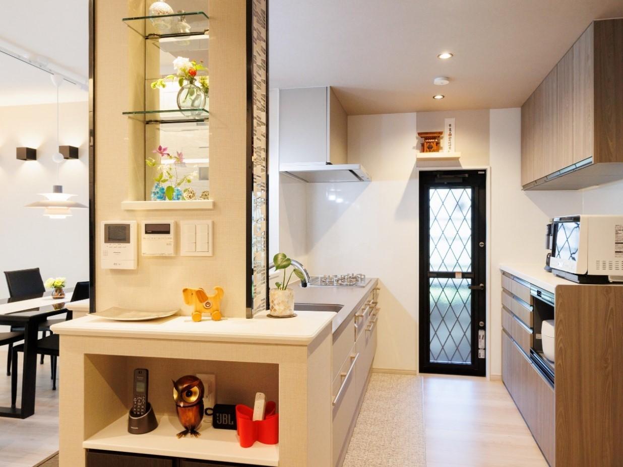 和室だったスペースは大部分がキッチンになりました。前は壁付キッチンでしたが、対面式キッチンにしたのでキッチンに立ちながらリビングやダイニングにいるご家族の様子を見ながらお話しすることができます。キッチンの脇にある既存柱を利用してスイッチやリモコン、埋込収納を設置しました。ガラス棚や鏡、タイルを使用し華やかな雰囲気になりました。キッチンはLIXIL『リシェルSI』をご採用いただきました。