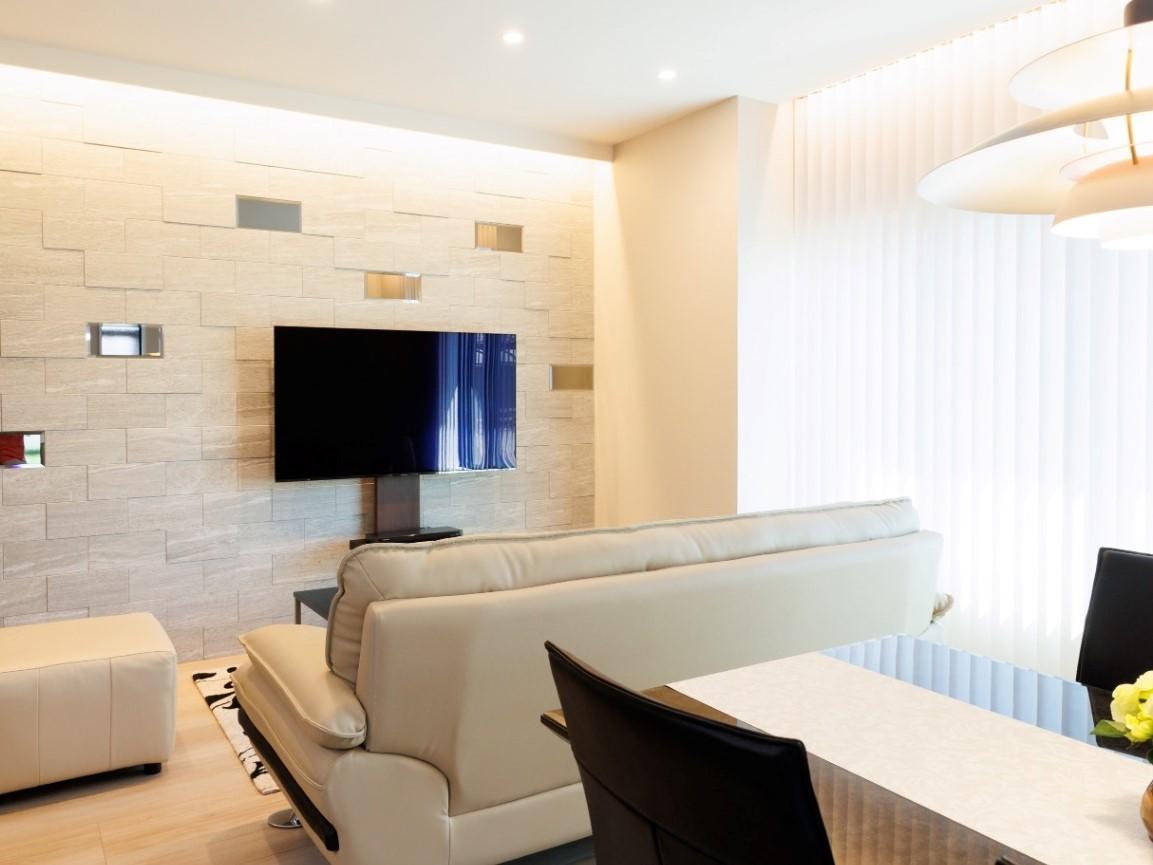 工事前に壁付キッチンだったところはリビングの大きな窓になり、光が差し込んで明るいリビングとなりました。テレビ台の後ろの壁にはLIXILの調湿できる内装壁機能タイル『エコカラット』を貼りました。使用したのは『エコカラットプラス ヴァルスロック』(グレー)になります。