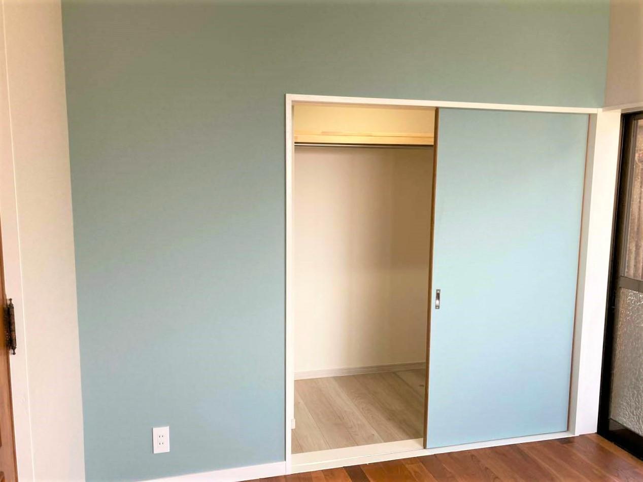 洋室にWIC(ウォークインクローゼット)を新設しました。間仕切りを撤去してキッチンになった和室の一部スペースを使用しています。壁の一面にはアクセントにブルー系のラメ交じりの織物調壁紙、リリカラ LV3077(旧品番です)を貼りました。