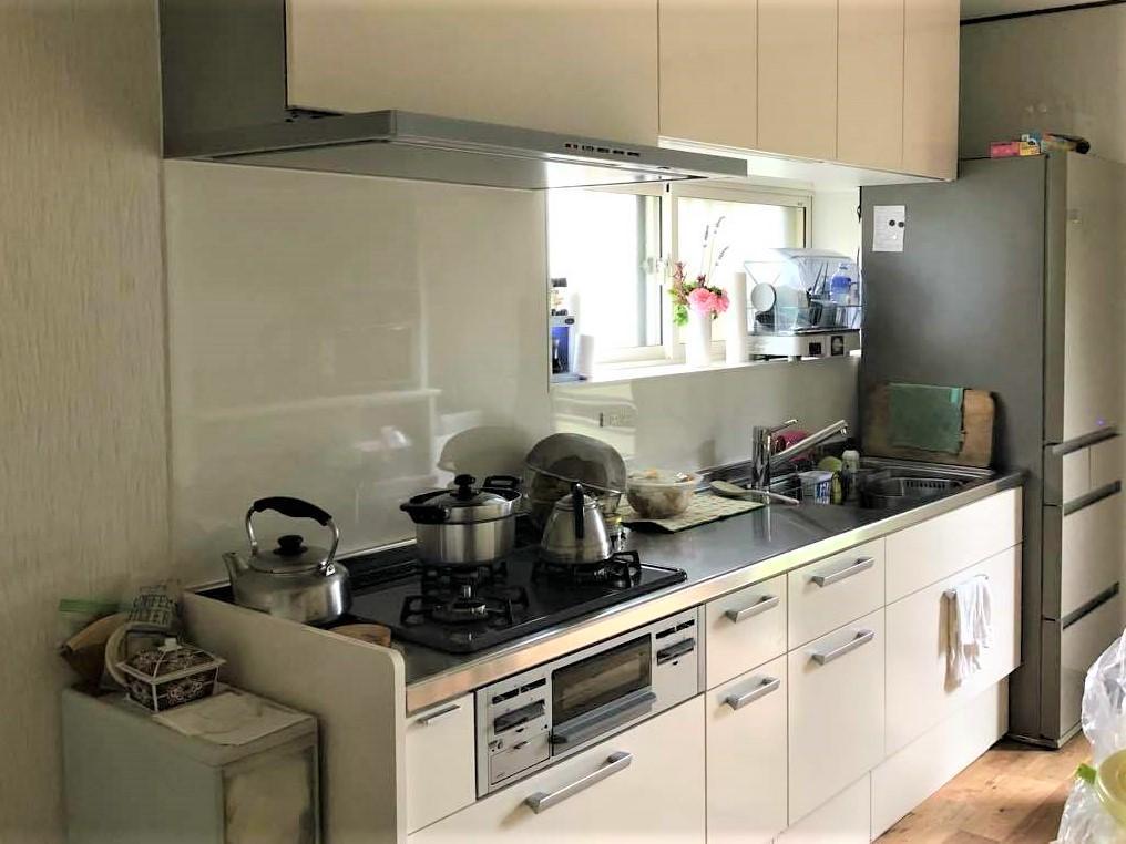 キッチンはLIXILの『リシェルSI』をご採用いただきました。「らくパッと収納」を選択し、斜めに傾く扉がポイントでテコの原理を応用して引出しを開ける力を軽くできるので、普段使いの道具がらくにパッと取り出せすことができます。キャビネットの扉やキッチンパネルをホワイトで統一し明るい印象です。今回、施主様のご要望によりキッチンの奥行を600mmにしました。キッチン全体の部屋の奥行が狭いこともあり、標準サイズより50mm小さくすることで全体のバランスを取るようにしています。窓から冷気が入り込むため冬場にキッチンに立つと足元がヒンヤリしていましたが、LIXILの内窓『インプラス』を取付けました。キッチンの空気の入替が必要な時だけ開けて、寒い日や暑い日は両方とも閉めておくことで、一年中外気温の影響をうけにくくなりました。また、キッチンは湿気が溜まりやすい環境のため結露してしまいますが、「インプラス」を取付けることで結露防止にもなります。