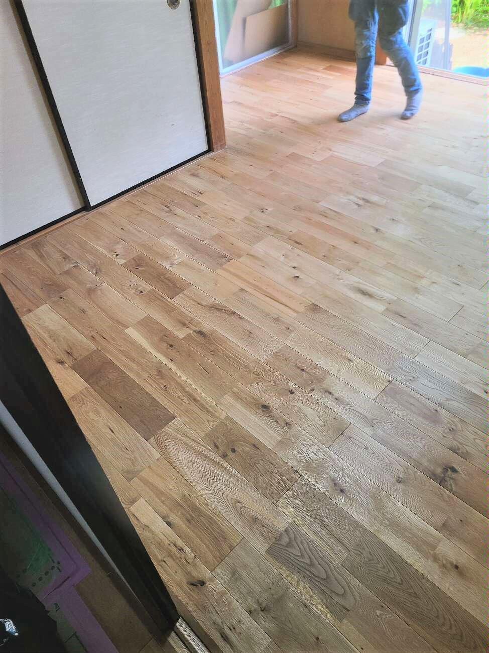 和室の床を畳からフローリングにしました。畳を撤去し、断熱材を敷き込み、無垢フローリングを張っています。木材本来の雰囲気を楽しむことができ人気の無垢材は、自然素材になるため同じ物がなくそれぞれの木のぬくもりや風合い、肌触りを楽しめるのが大きな魅力です。既存の廊下もフローリングでしたが、無垢フローリングを重ね張りしました。無垢材には調湿作用があるので夏はサラッと、たくさんの空気を含んだ無垢材はその空気が断熱の役割を果たすため冬は温かく感じられ、素足でも快適にお過ごしいただけます。