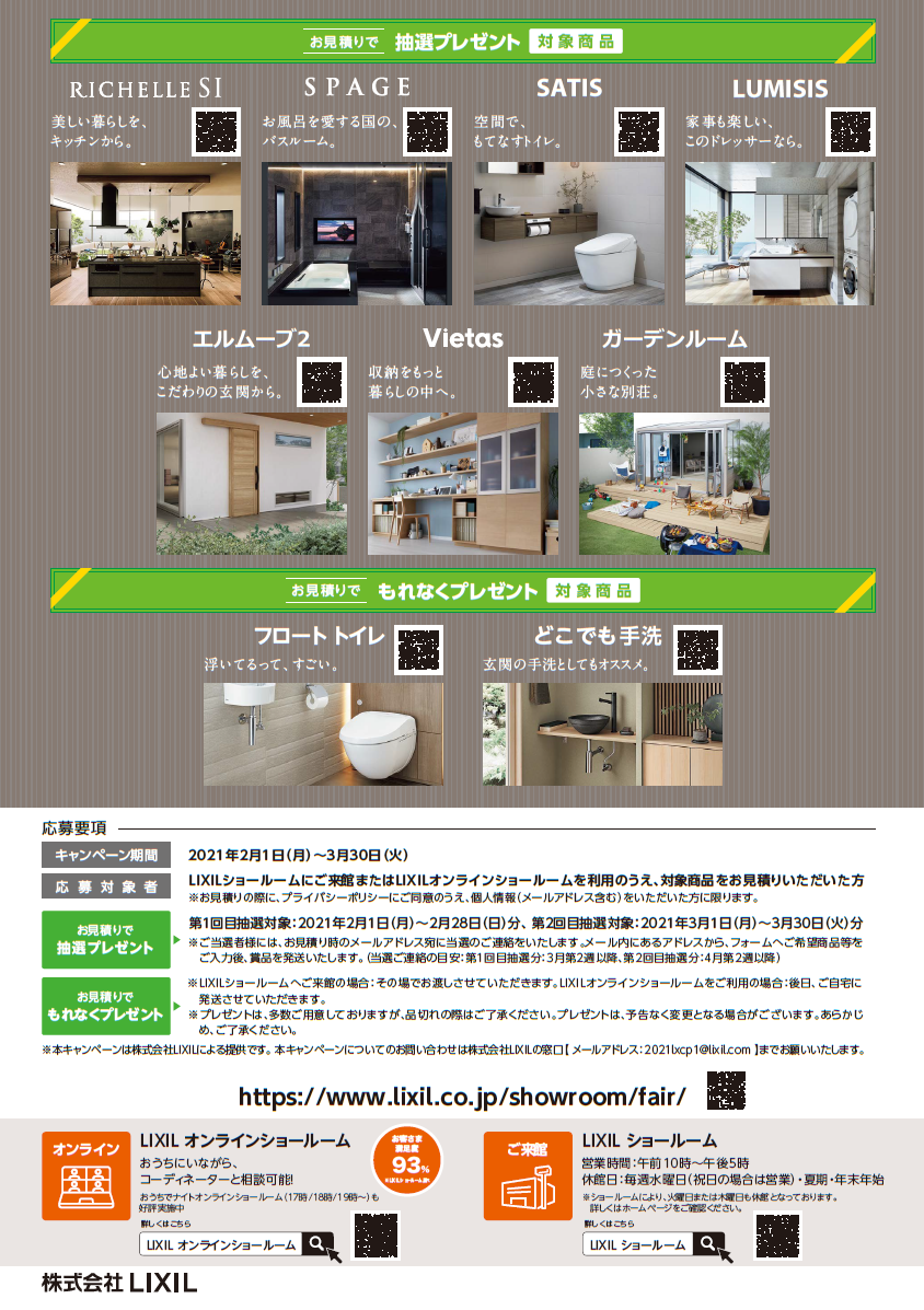 キャンペーンチラシをご覧いただくか下記LIXILのキャンペーン特設サイトをご確認ください。