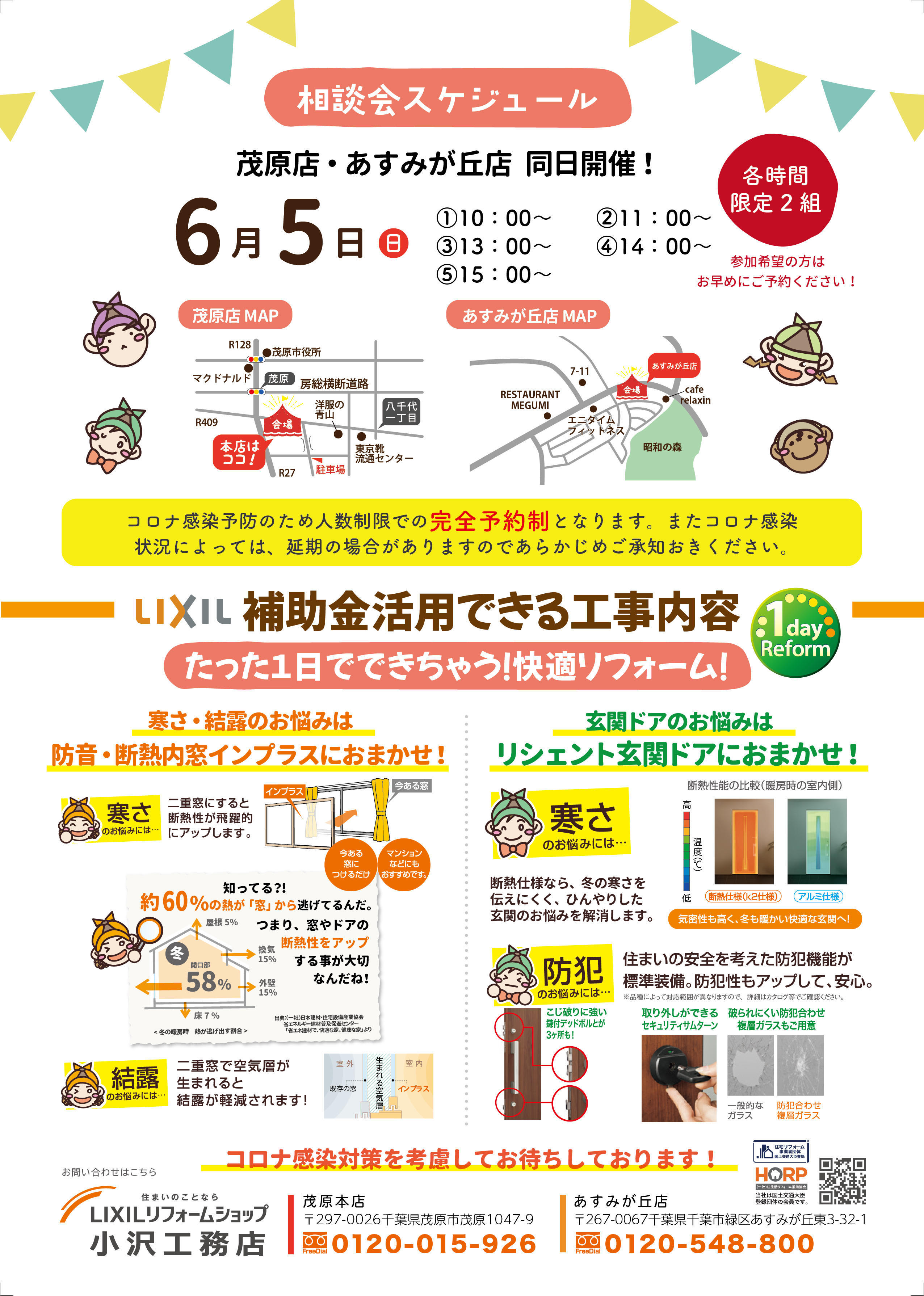 お電話でのご予約の場合は、各店舗に直接ご連絡いただき「補助金説明会の予約」とお伝えください。