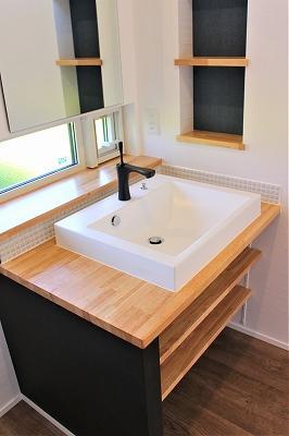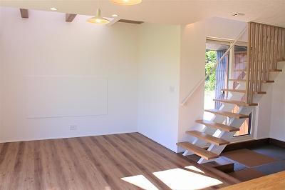 奥には吹抜けから明るい光が差し込むリビングがあり
