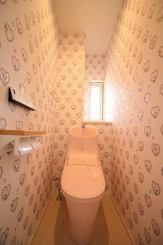 お店みたい!ピンクのトイレにピンクのクロス♪