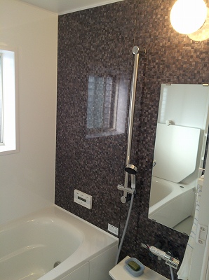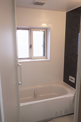 明るい浴室ですが、壁のアクセントによって落ち着いた雰囲気に仕上がっています。