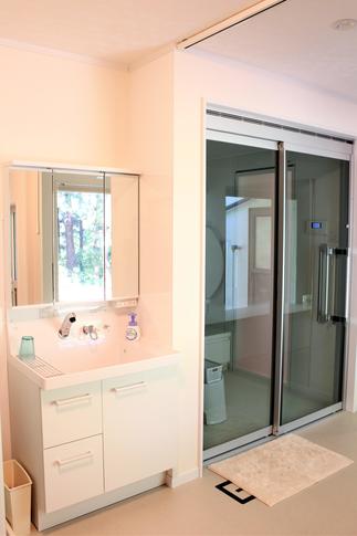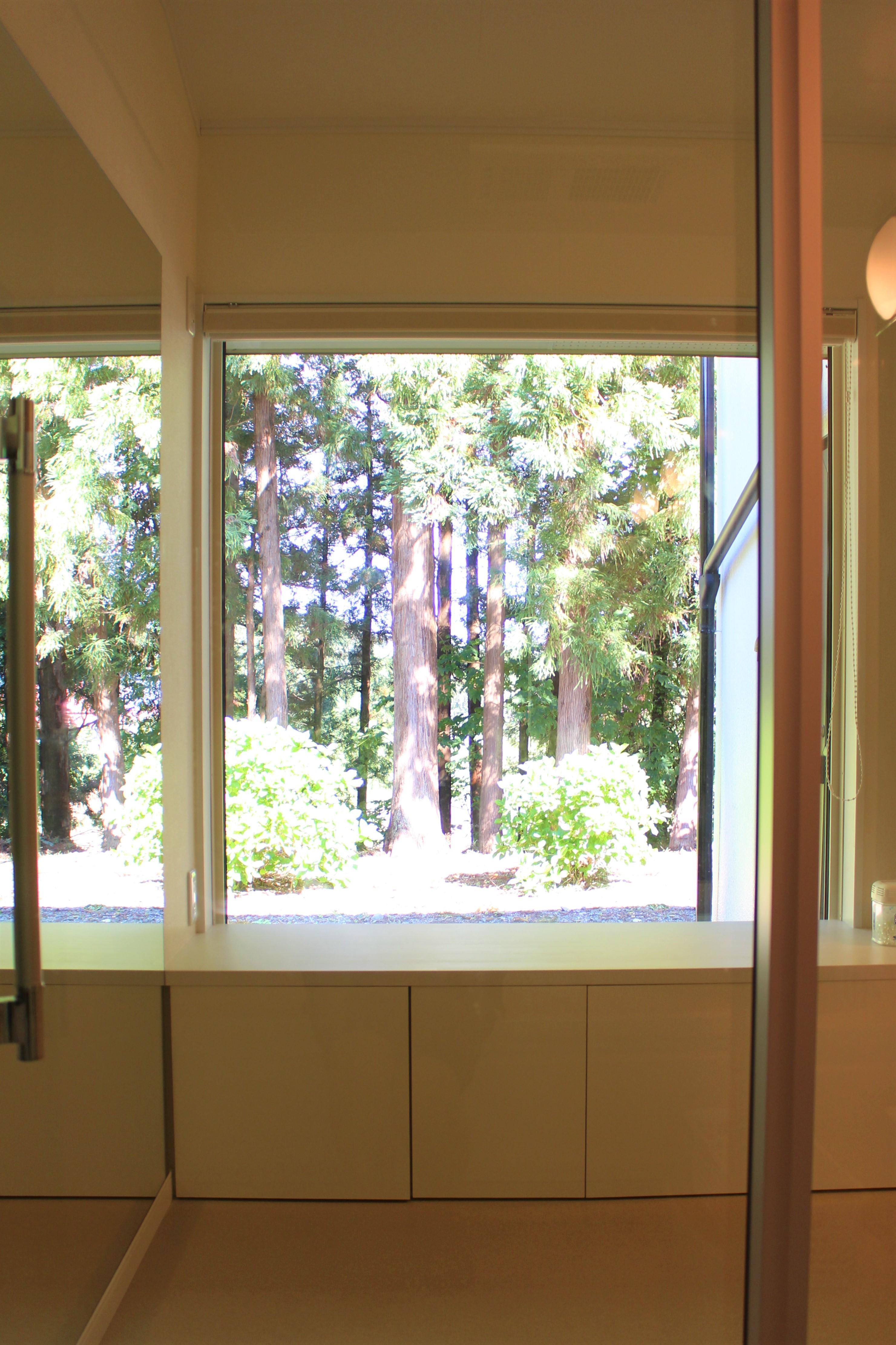 古くなった浴室を新しく。洗面脱衣室の内装もリニューアル。大きな窓を取付け、腰かけられるような造りにしました。バスルームの透明なドア越しに大きな窓から見えるのは、眩しい裏庭の緑。究極の癒し空間が完成しました。