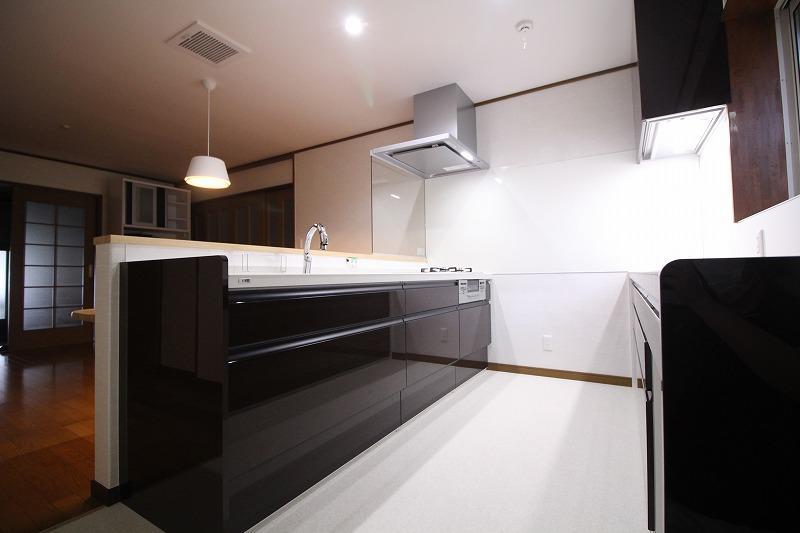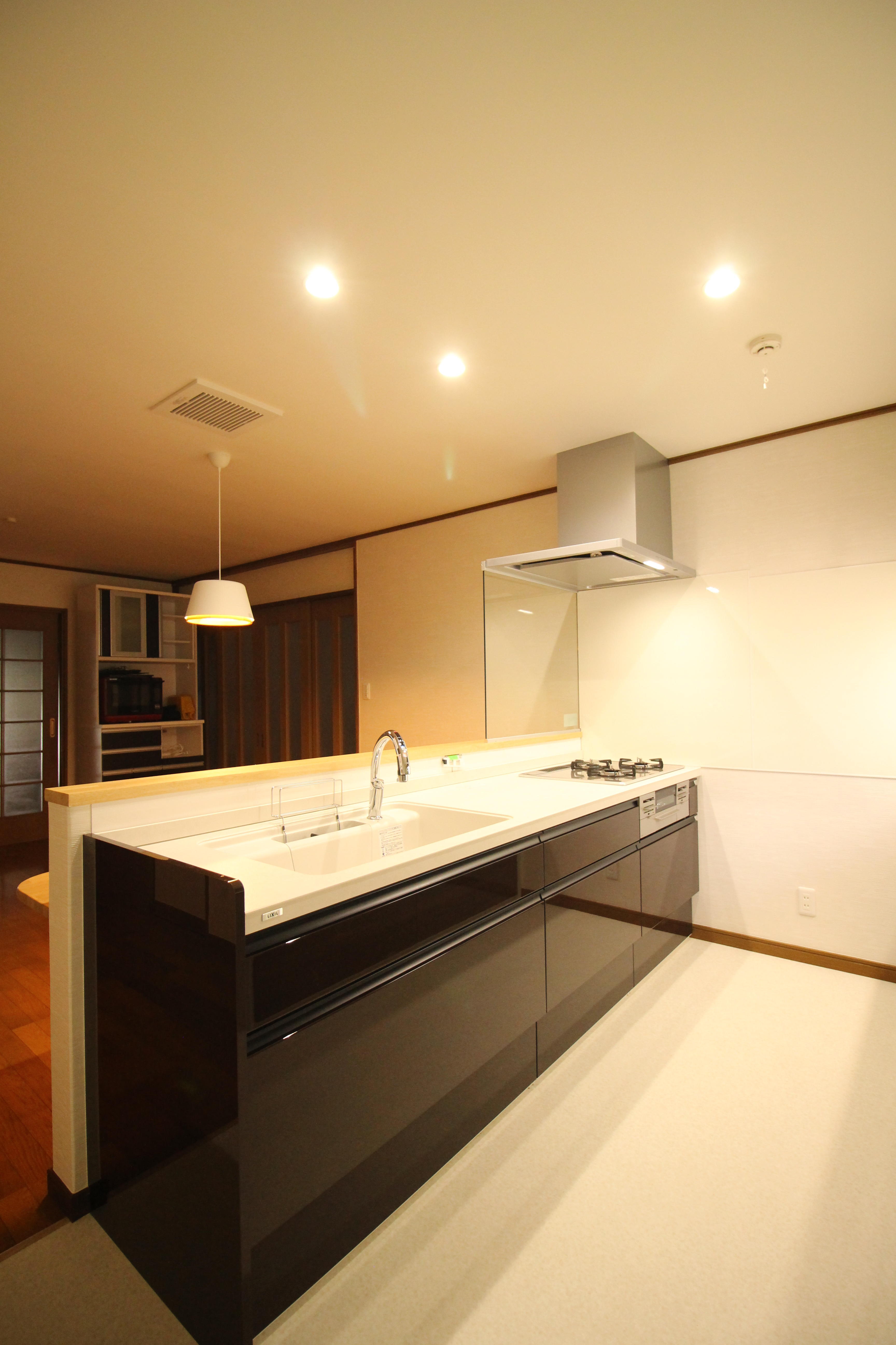 キッチンを改装リフォーム! 床の一部を残し、キッチン床・壁・天井を貼り替え、明るく清潔感のある空間になりました。 キッチンはLIXILのリシェル。見た目の美しさだけではなく、天板が丈夫なセラミックで出来ているので、キズつきにくく熱にも強いので、傷みを気にすることなくお料理が出来ます。