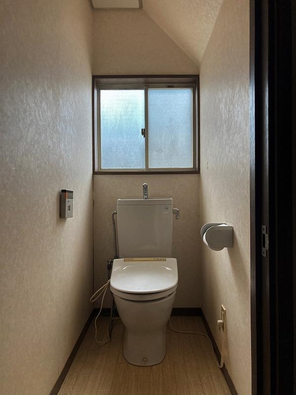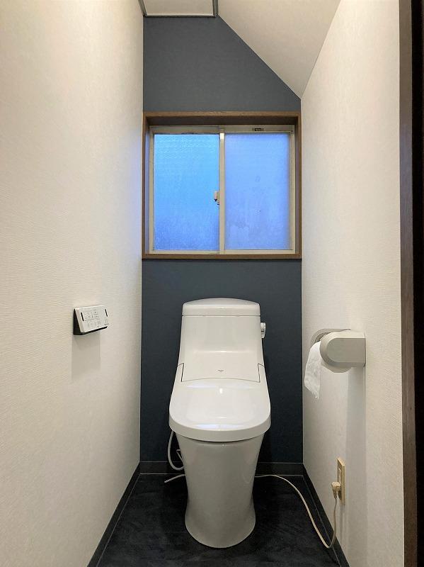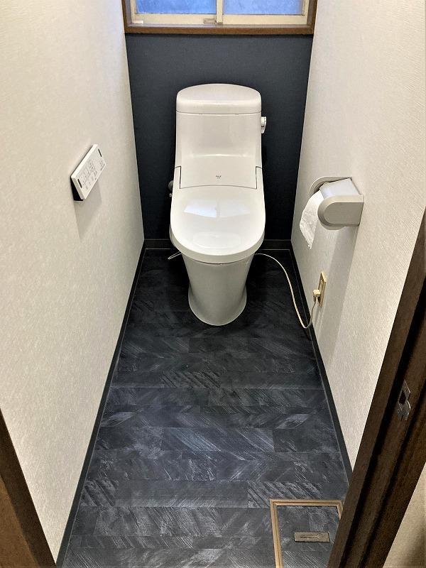 トイレ本体を交換するのに合わせて、床や壁紙を一新。 トイレはLIXILのタンク一体型トイレのアメージュZAに交換。スッキリとしたデザインで節水タイプです。 床のクッションフロアや壁紙も貼り替えて、ネイビーが効いたスタイリッシュな雰囲気ににガラリと変わりました。