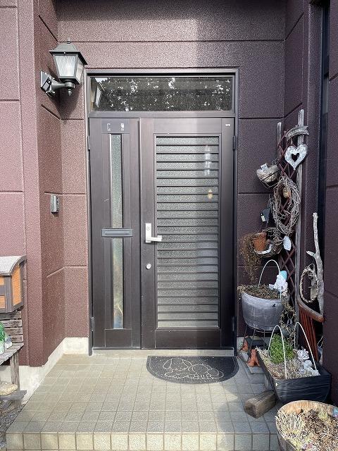 LIXILのリフォーム用玄関ドア「リシェント」に交換! 既存のドアを取り外して、残った枠の上から新たな玄関の枠を取り付けるので、外壁やタイルをはがすことなく、1日の工事で完成します。