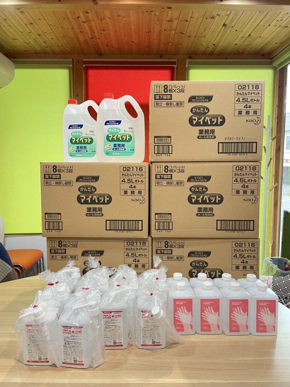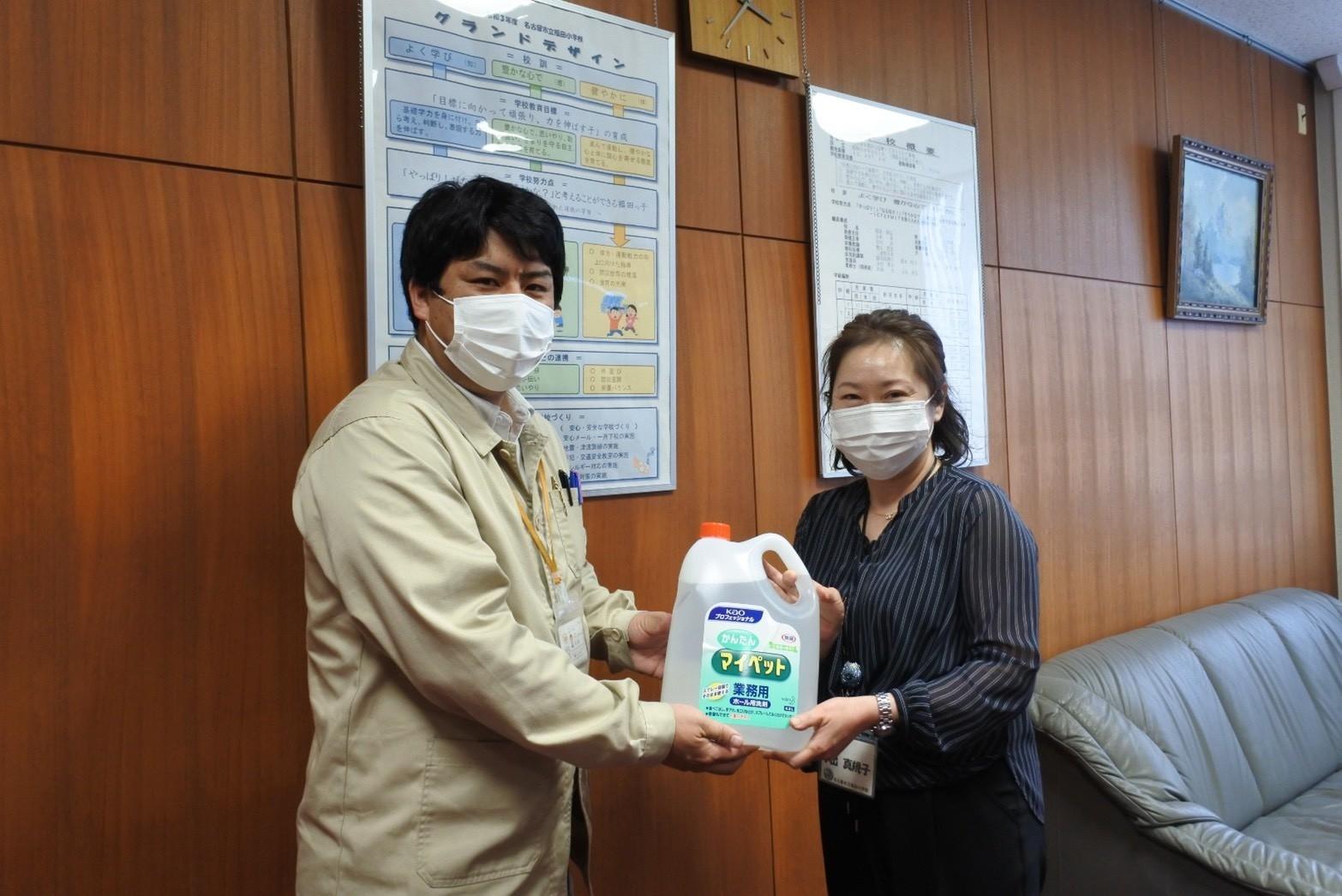 弊社が営業させて頂いております、名古屋市港区の南陽4学区の小学校へ、お役に立つものと校長先生とお話をさせて頂いた結果、コロナで消毒液がすぐになくなってしまうということもあり、今、一番必要としている物を贈らせて頂きました。