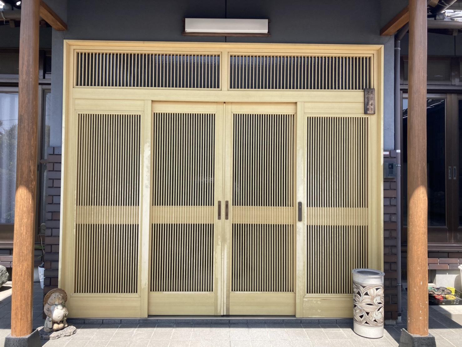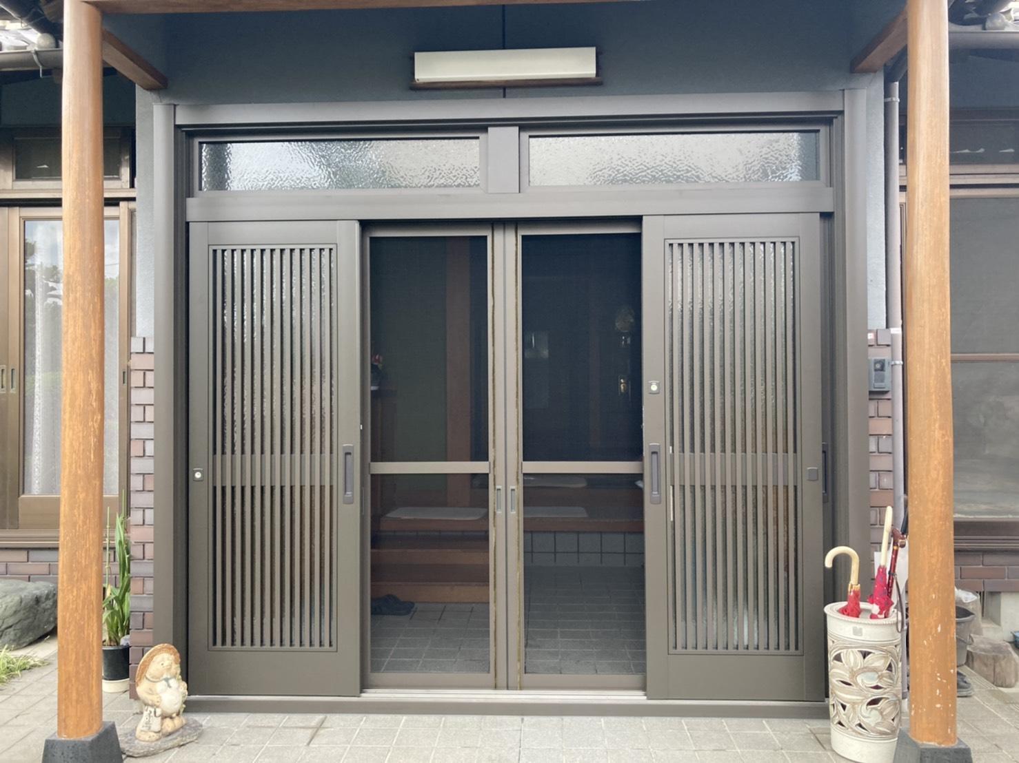 玄関表面の剥がれが気になるとお話をいただき色々とお話をさせて頂き、 ランマ付きの引戸で、網戸もしっかりしている玄関引戸をご提案させていただきました。