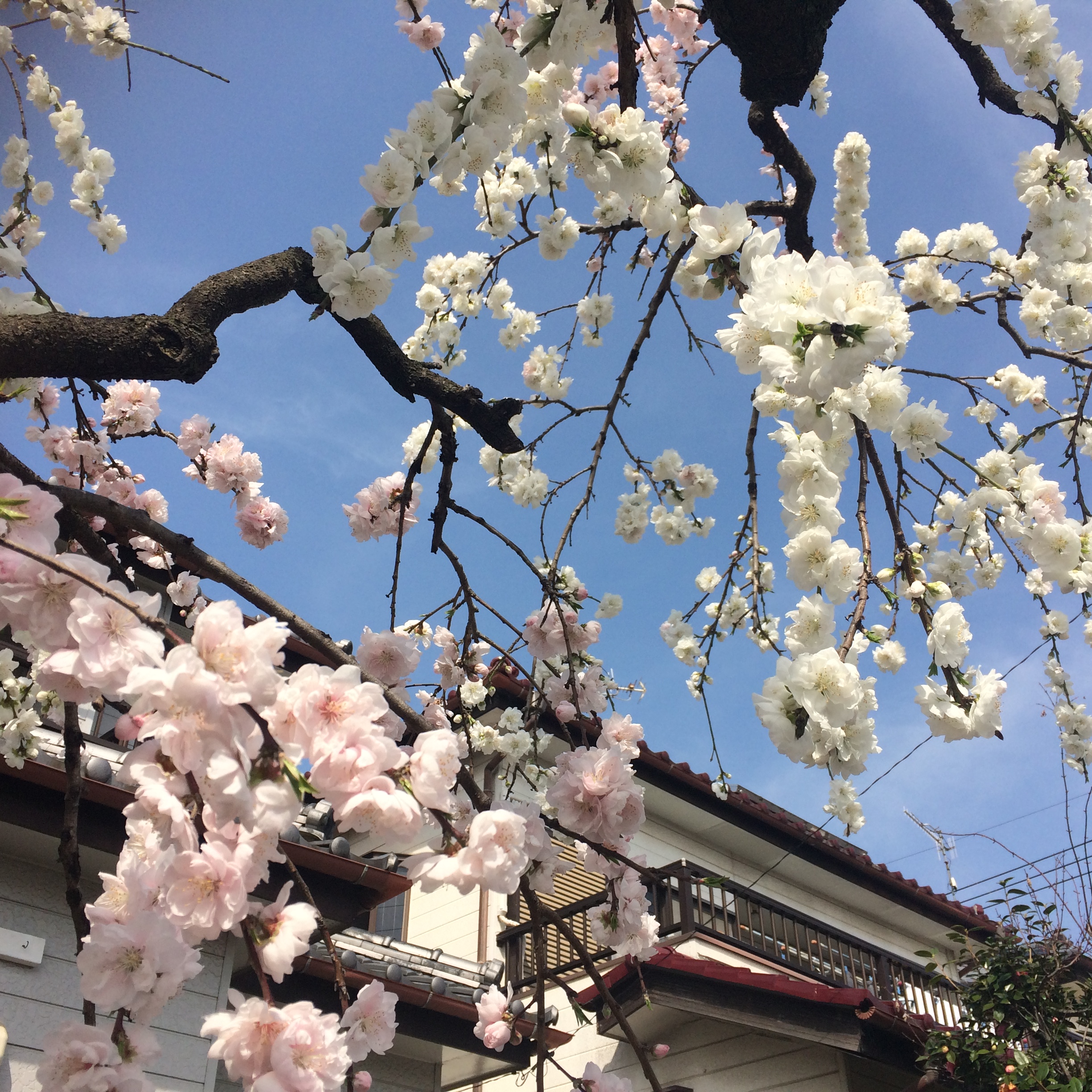 白とピンクの花が青空に映え かわいらしく咲いていました