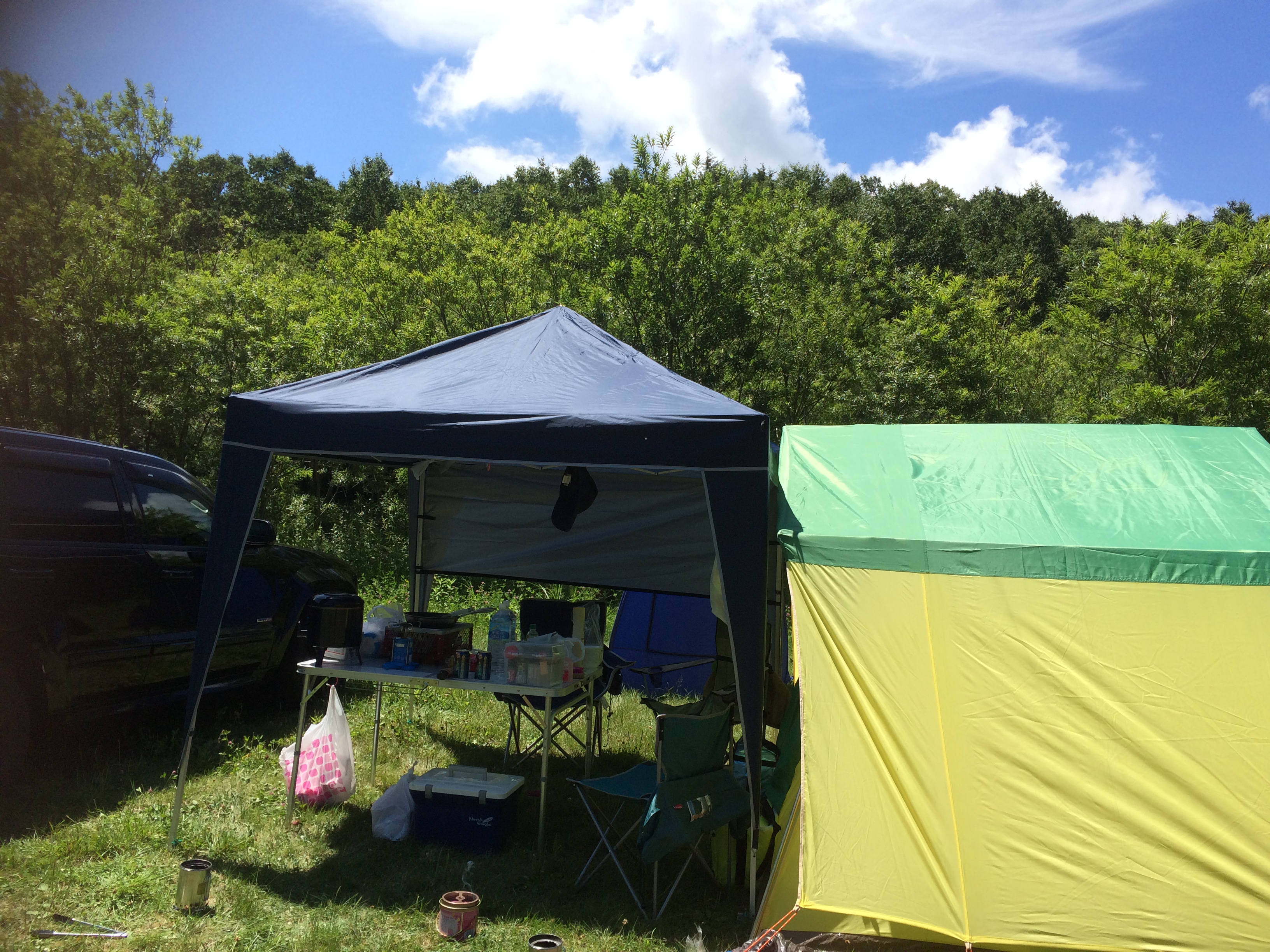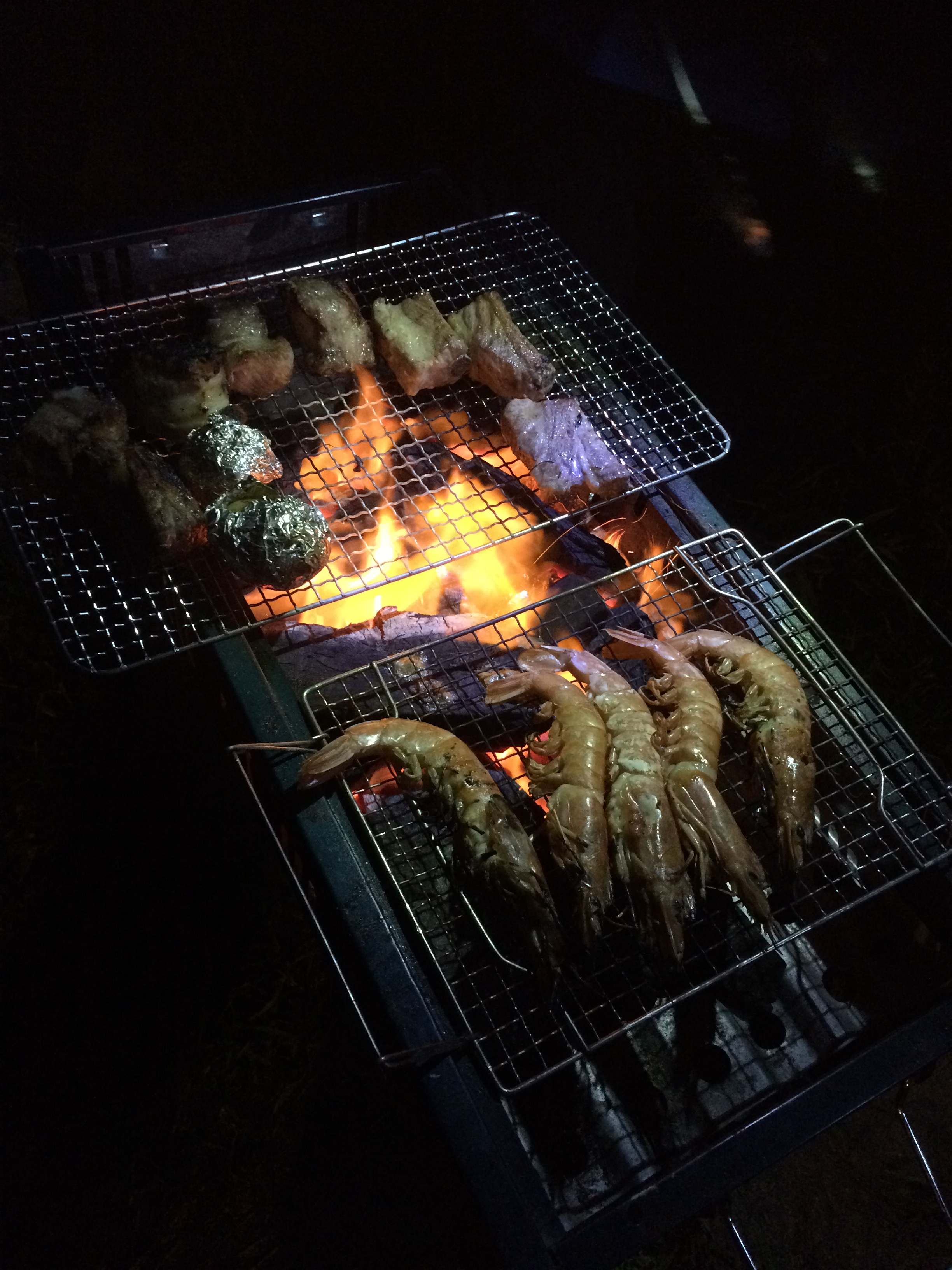 テントを張って炭に火をおこして暗くなってから夕飯です