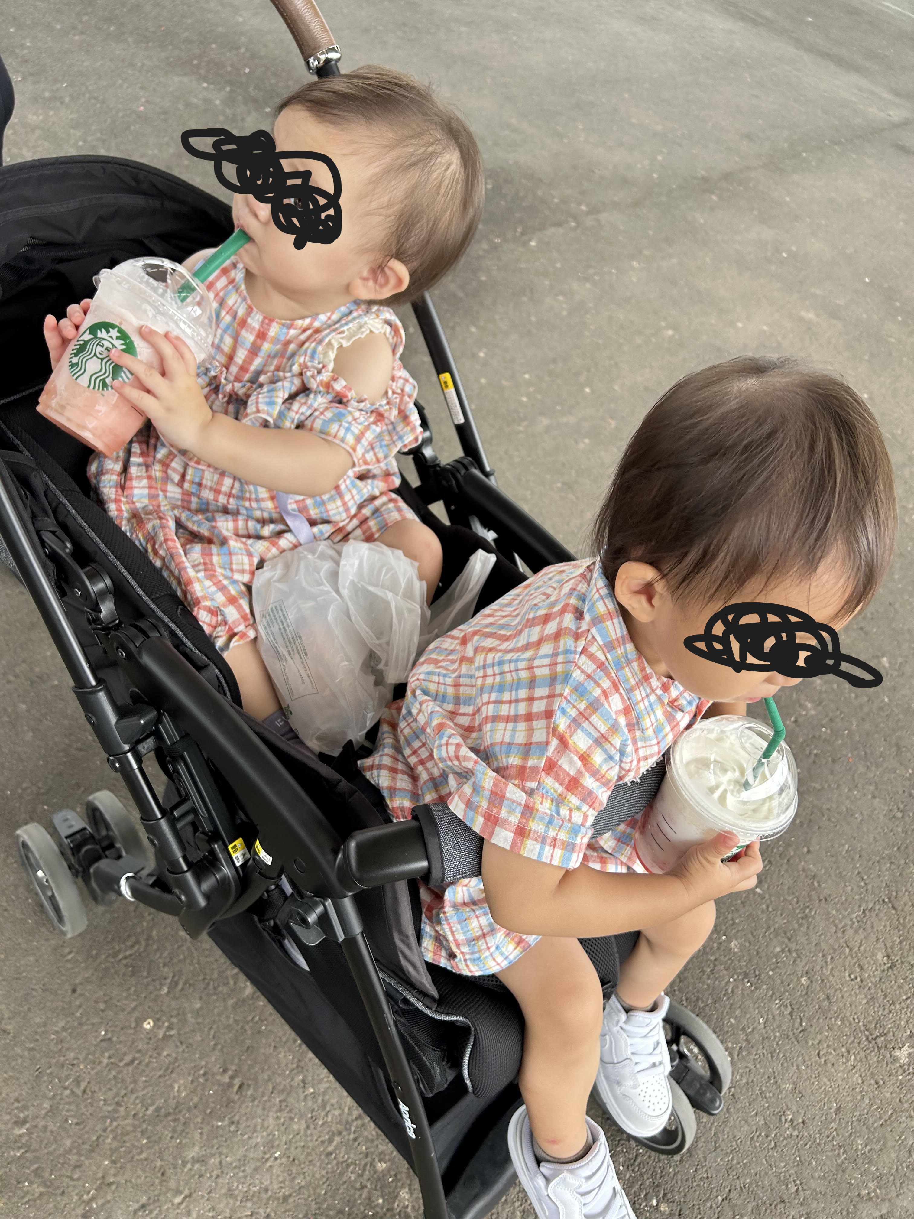 一人乗りベビーカーに二人を乗せて出かける派です。