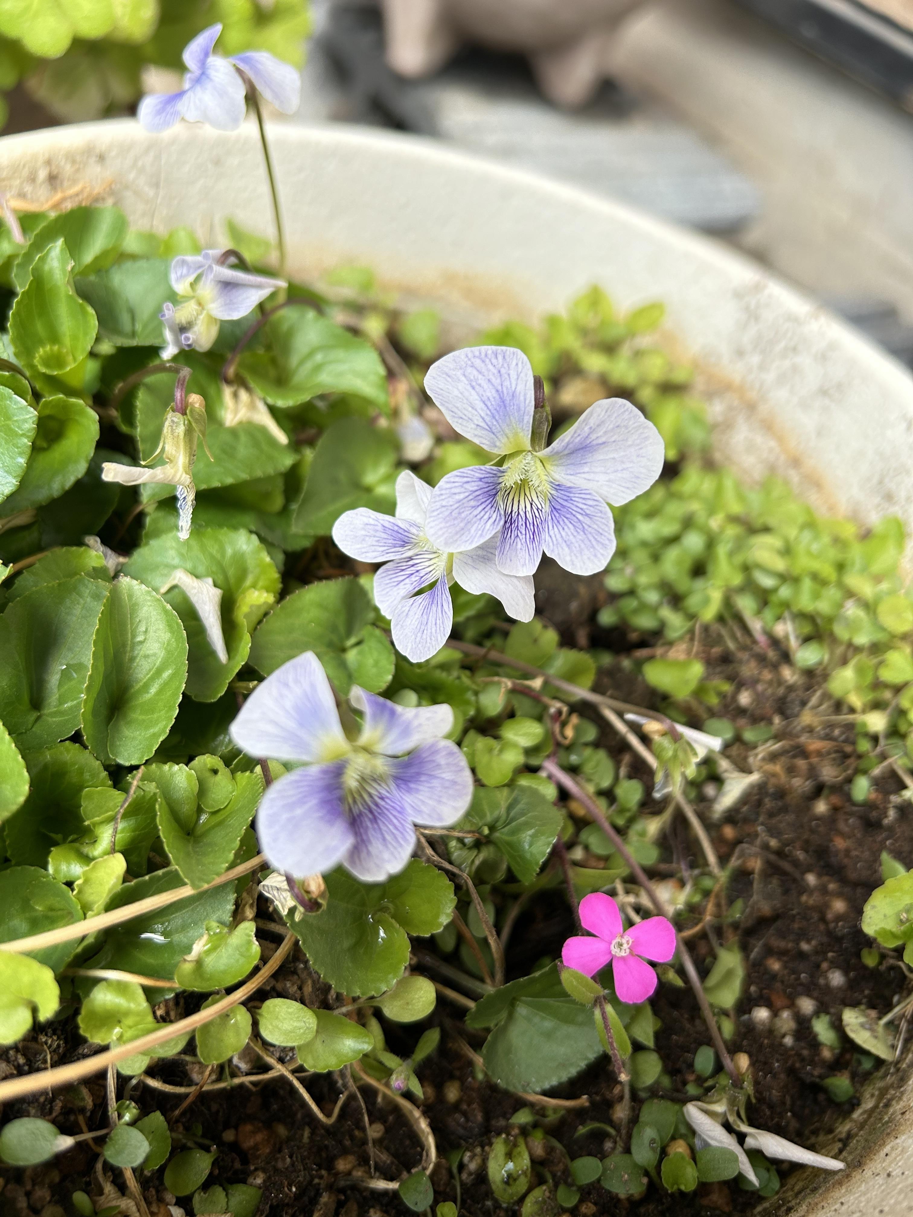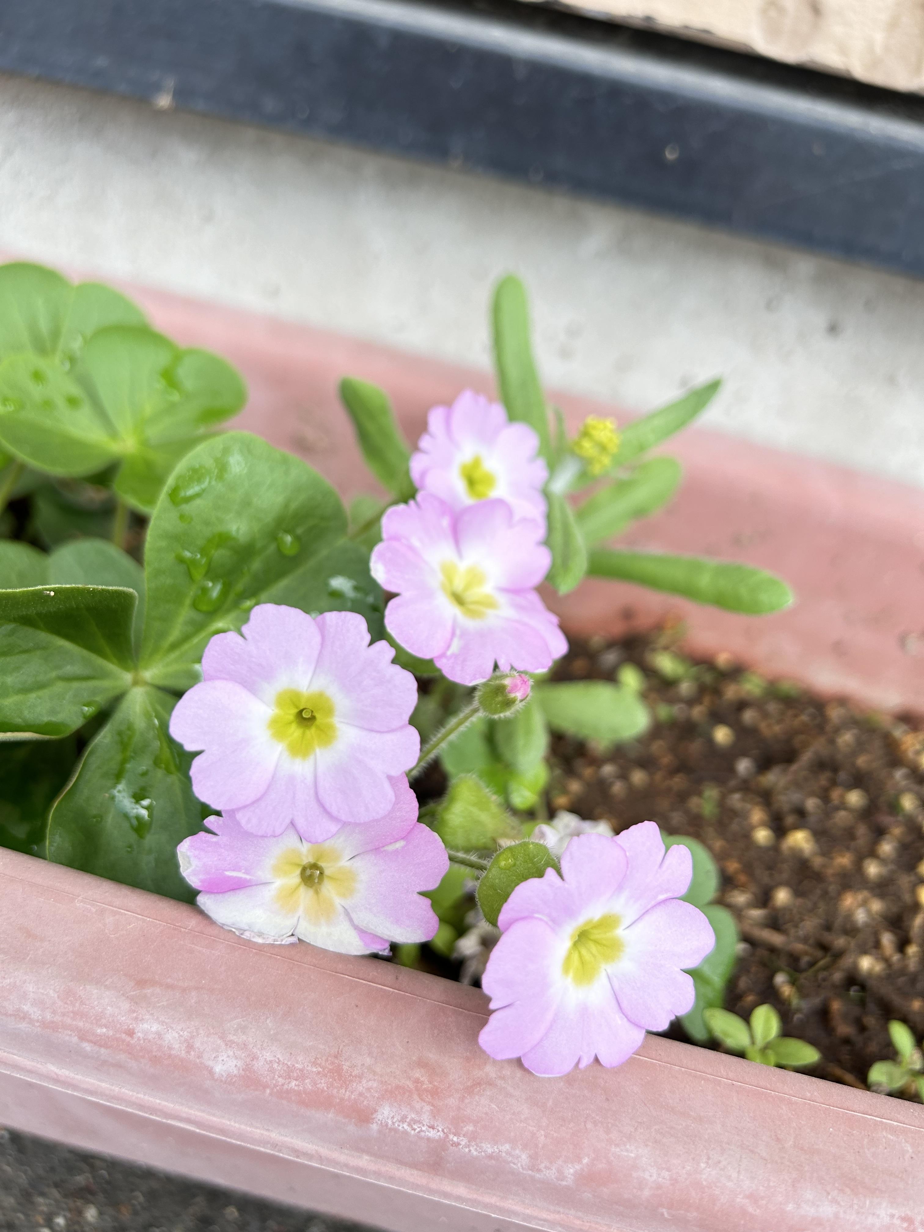 事務所の前にある植木鉢に緑が生え、お花も咲くようになりました。