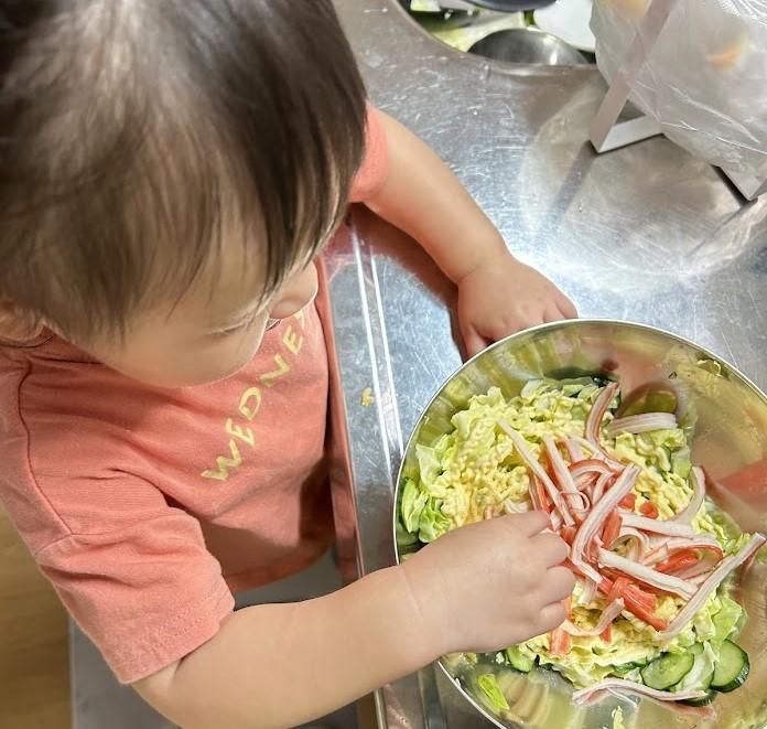 娘に関してはまだ和える前のサラダに素手を突っ込んでいて