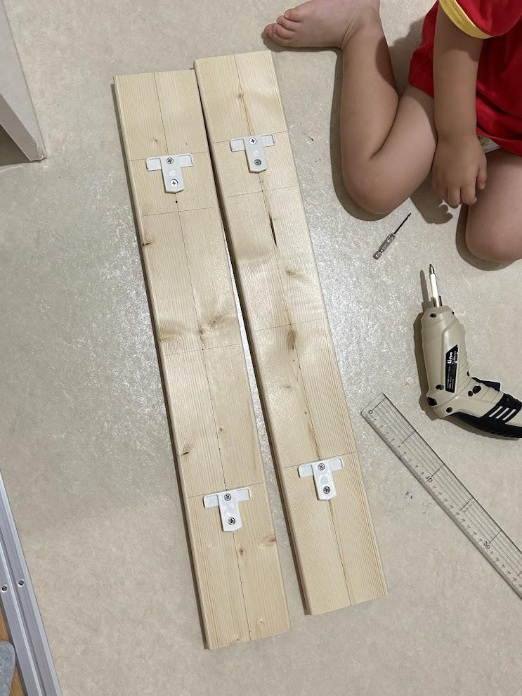 まずは木材に目印をつけて位置を決め、部品取り付け。