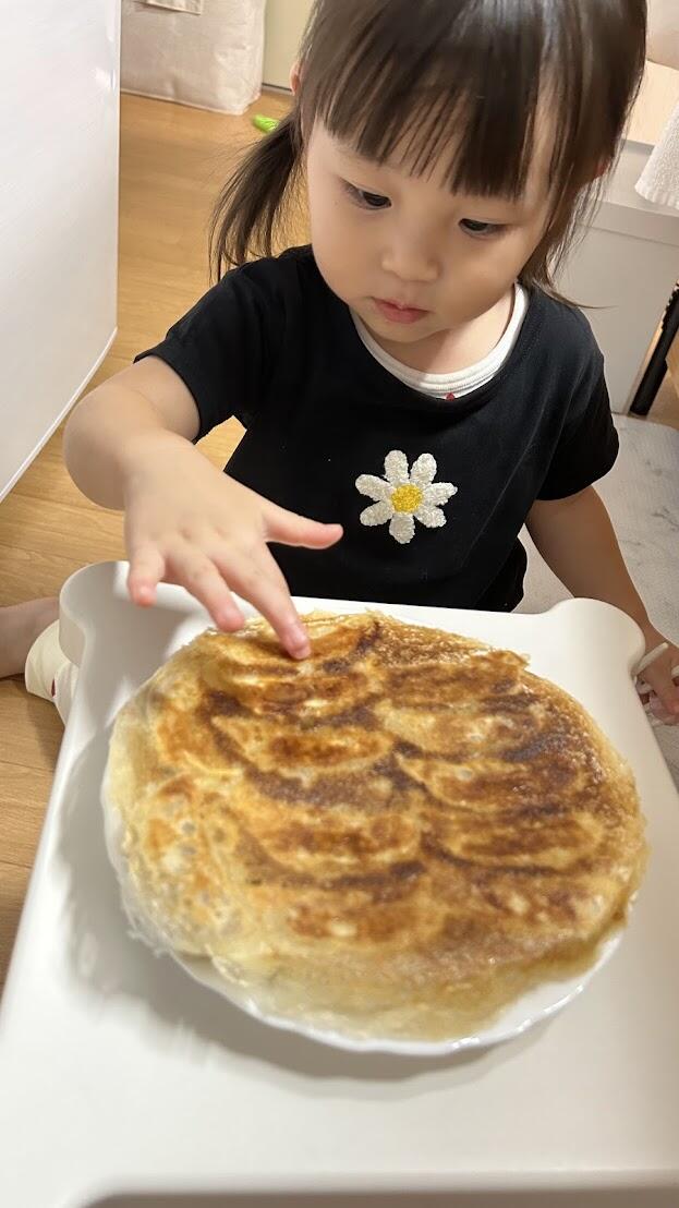 いつもは蒸し焼きで生地をモチモチにしているのですが、パリッと焼いてる方が好きらしいです(^_^)![]()
