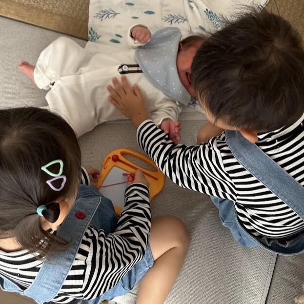 赤ちゃんを見てお世話したい欲が芽生えたのか、抱っこしたい!と2人とも大騒ぎで大変でしたが、まだまだ首が座る前なのでさすがに抱っこはやめさせました・・・(^^;)
