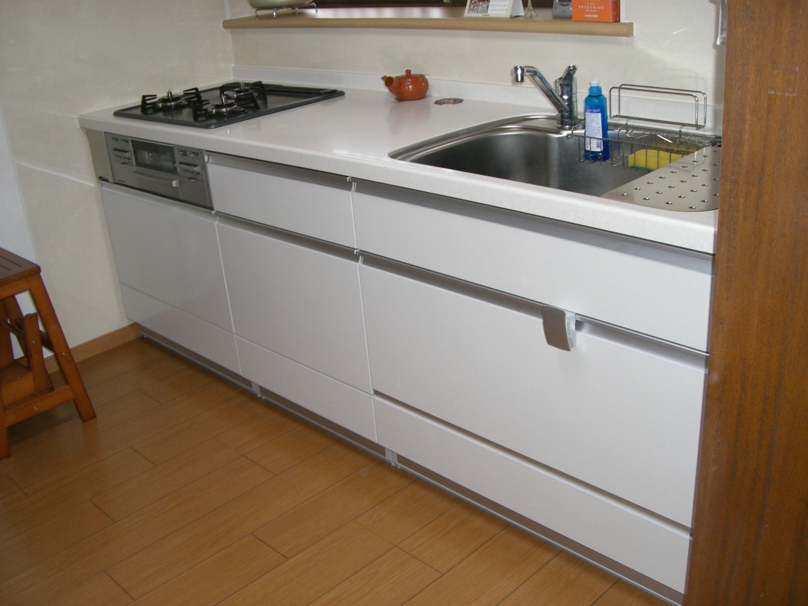 Y邸よりキッチンの改修工事の依頼を頂きました。以前のキッチンは、レンジ廻りのステン色が寒々しい印象を与えていました。そこで、キッチン扉とキッチンパネルをホワイト色に統一レイアウトはL型からI型へ。広々とした明るいキッチンへ生まれ変わりました。 キッチン : サンウェーブ アミィ 壁付I型 間口2250、床 : トステム ハーモニアス12 木目タイプ