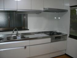 K様邸のキッチンはL型でしたが、コーナーキャビネットがデッドスペースになっていました。そこで思い切って L型→I型へ変更。デッドスペースがなくなり収納力もアップしました。 キッチン:サンウエーブ リシェル 壁:リリカラ クロス 床:東洋テックス AA3 出窓カウンター:アイカ カウンター