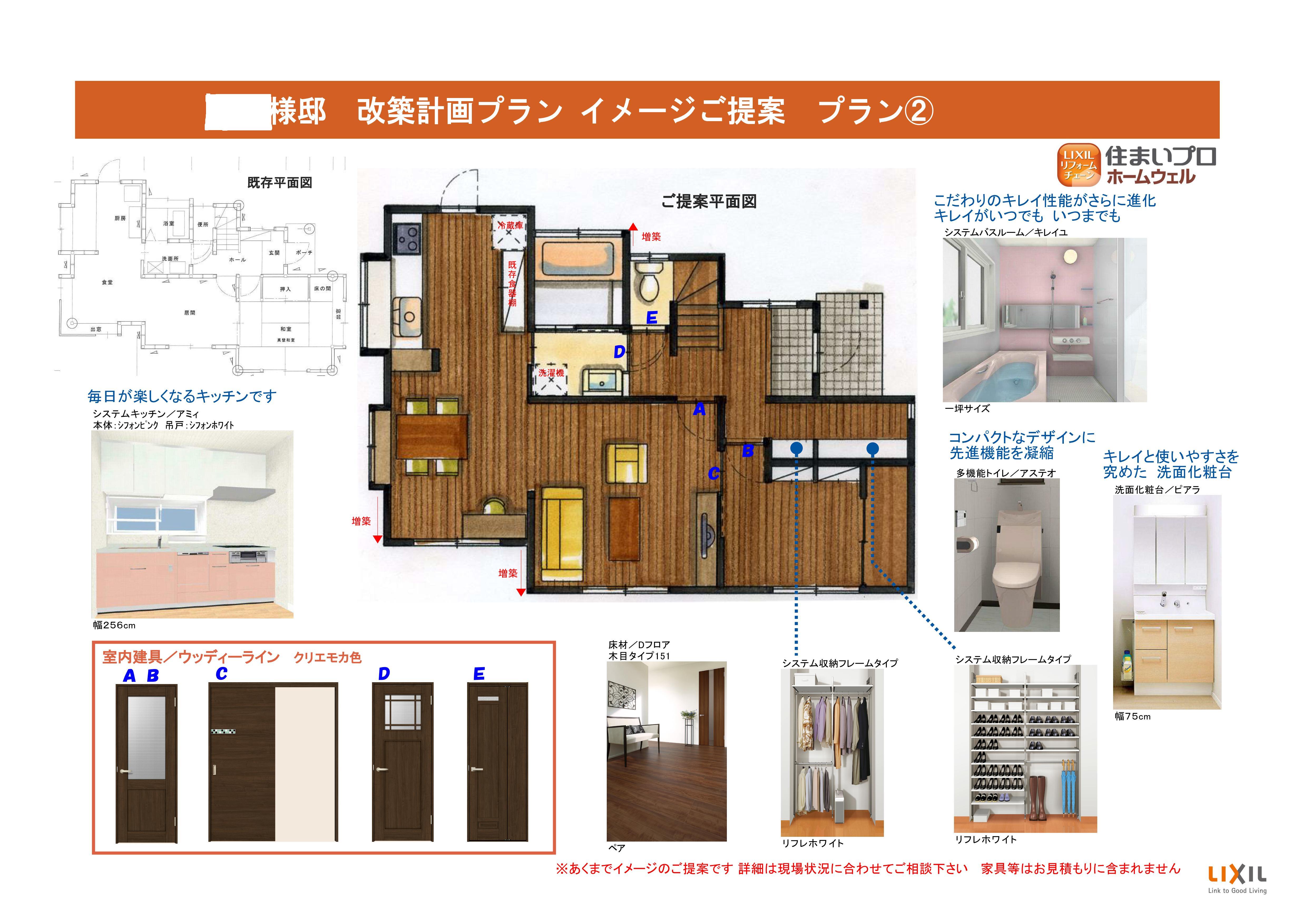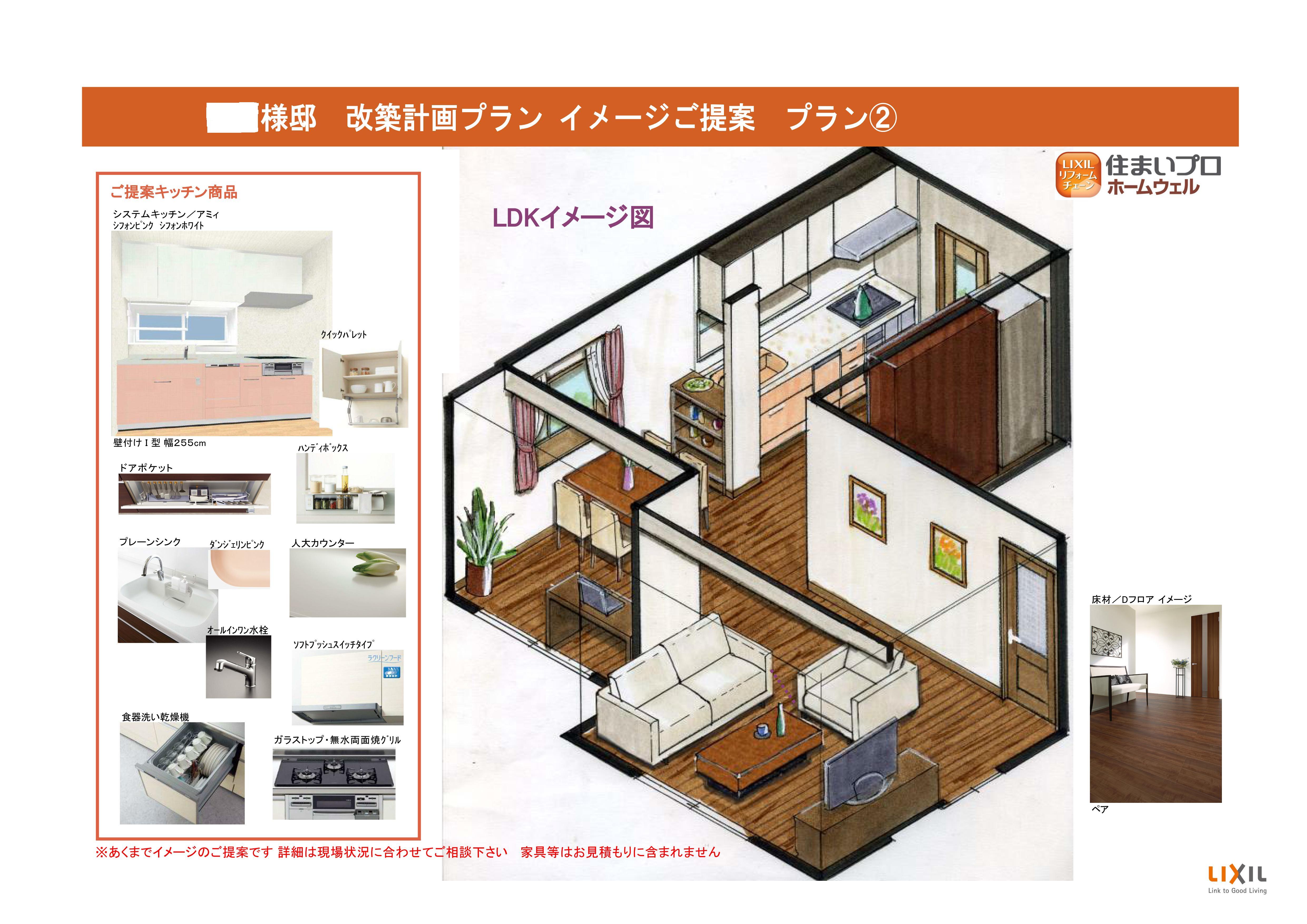 一階の平面図です。最初にお施主様がお家の図面をお持ちなら、現在の間取りや耐震性などを確認しながら、ご要望をお聞きしプランニングしていきます。点線部分が2階の範囲です。