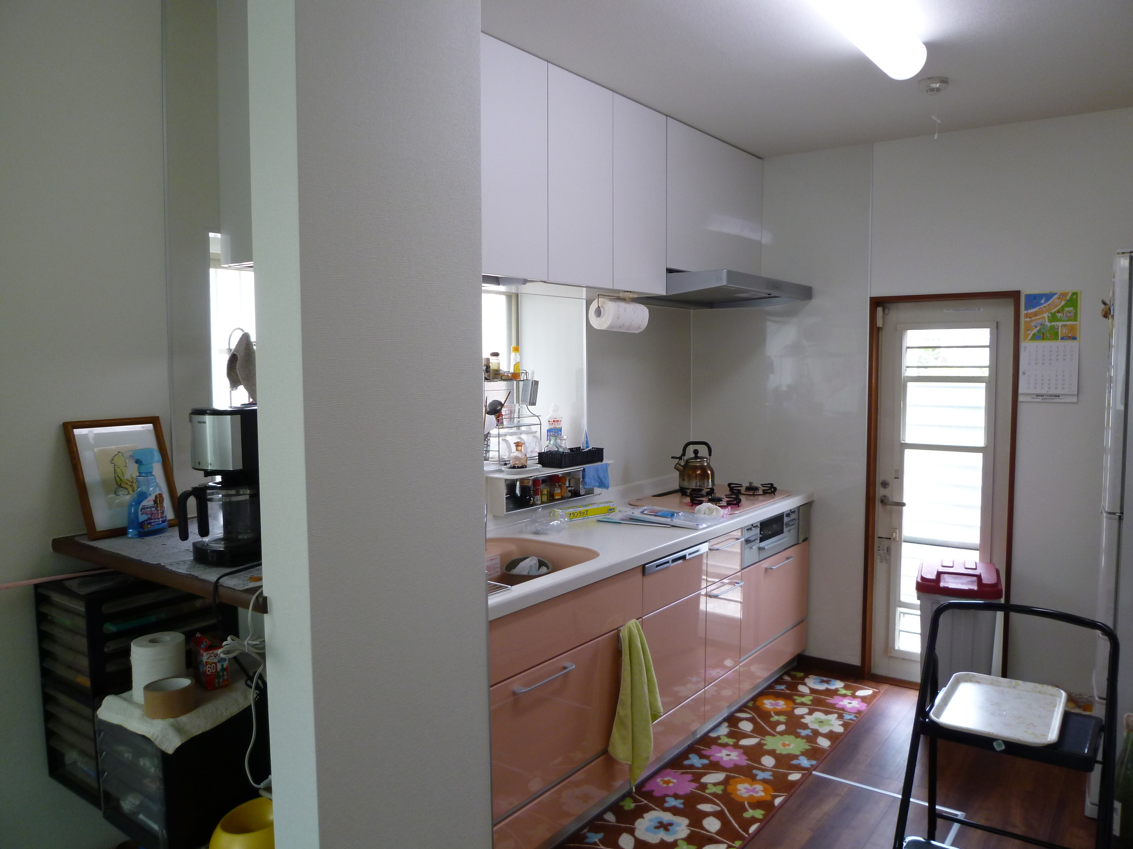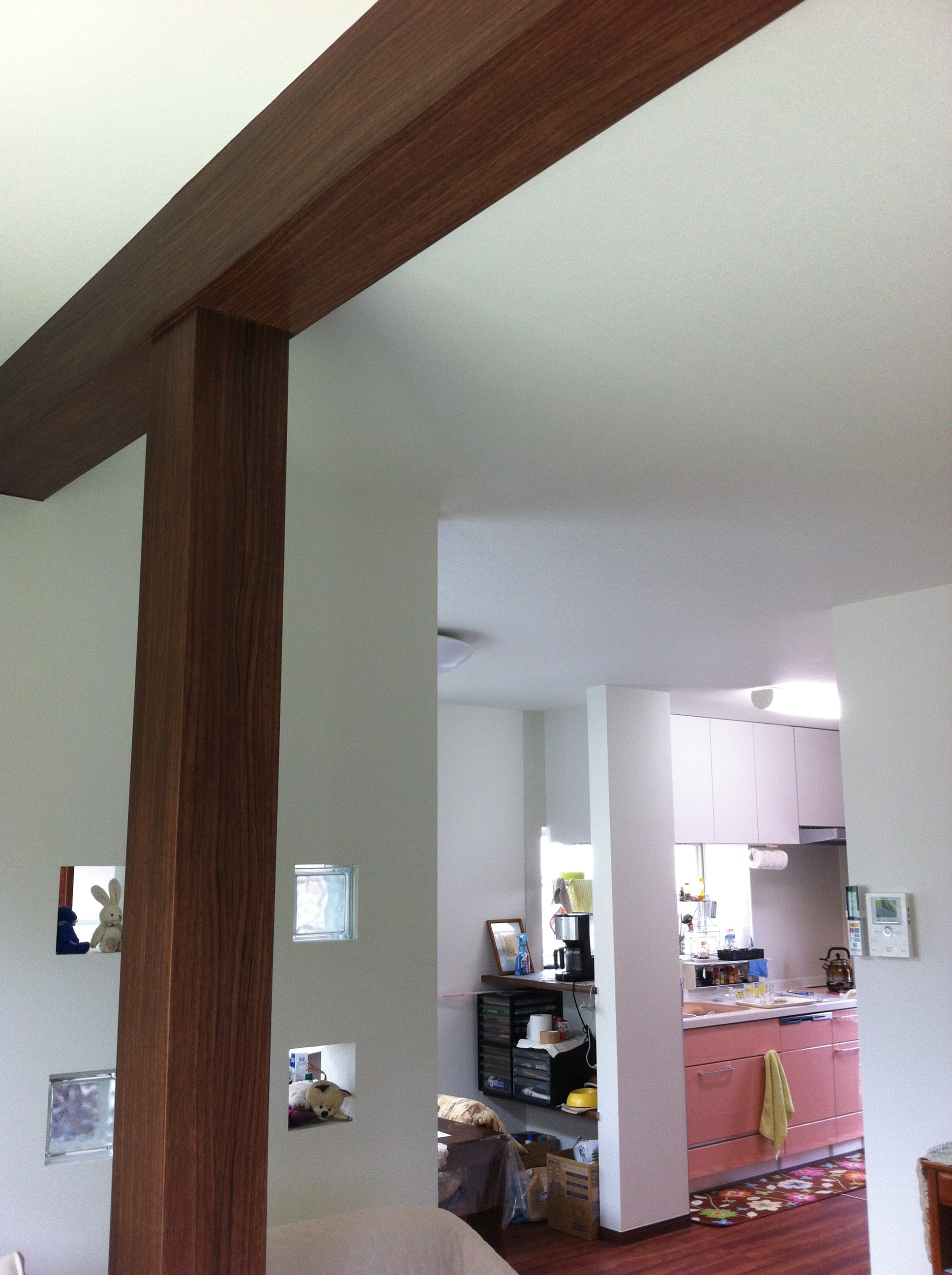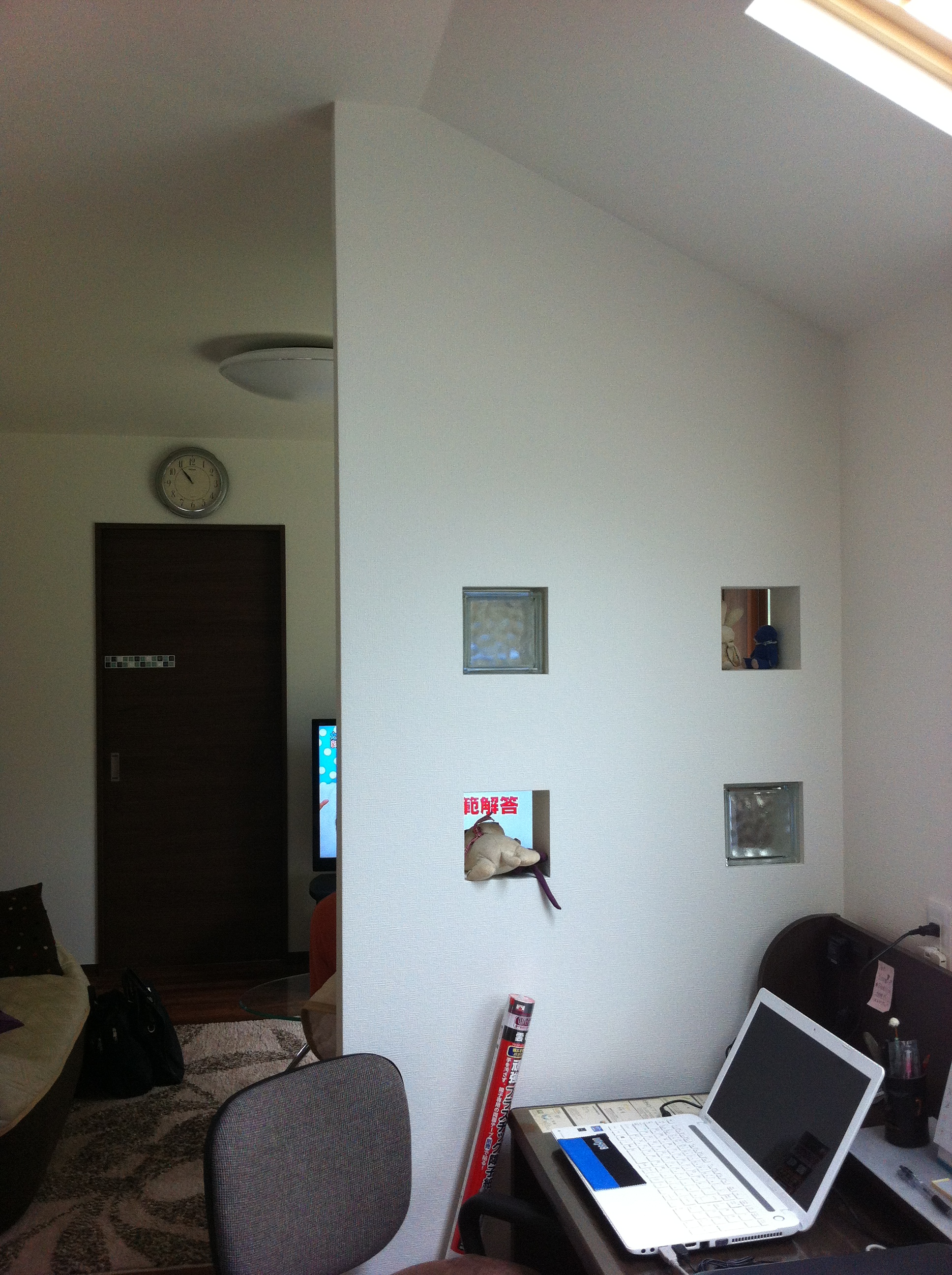 旦那様のこだわりのパソコンスペースです。既存壁部分が筋交が交差(たすき)して入っている為、構造上どうしても壊せない壁の為、筋交に干渉しない部分に15cm 角の明かりとりを作りました。増築部分、勾配天井の下屋にはトップライト(天窓)を施工しました。