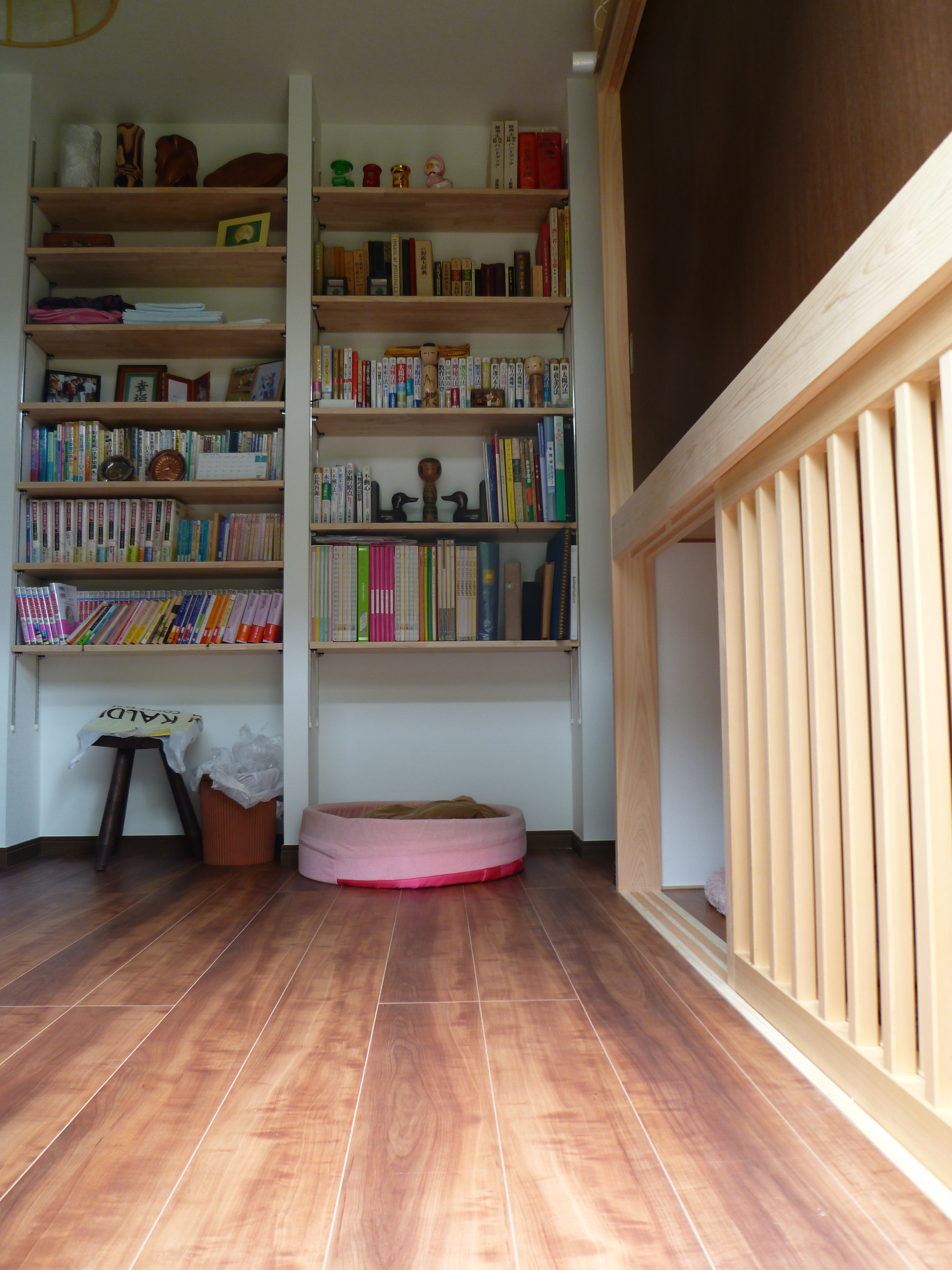 本を読みながら、愛犬と一緒に過ごせる空間です。収納棚の下には、来客の際のワンちゃんゲージを作りました。
