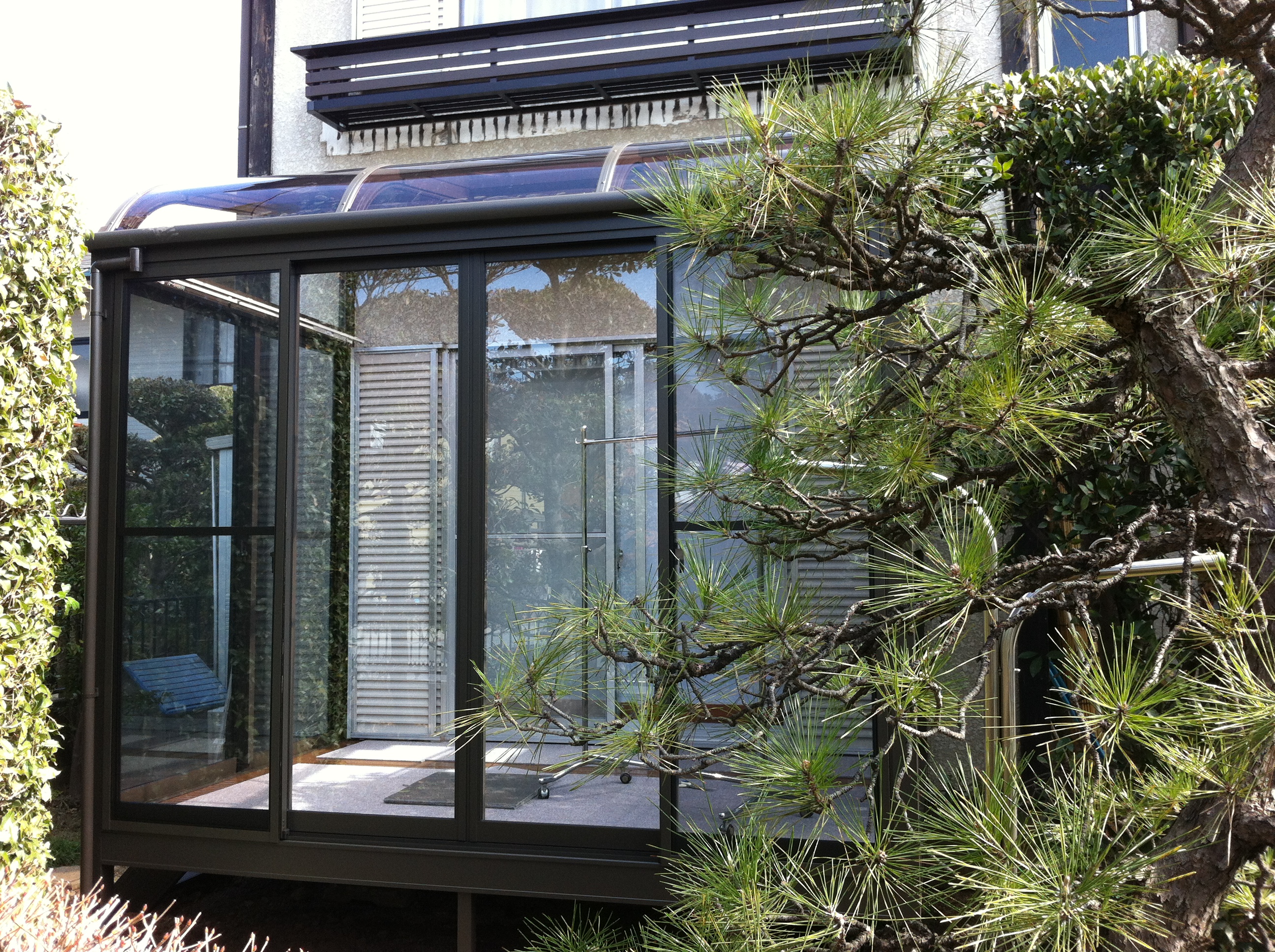 TOEX サンクスペースⅡ1.5間x6尺 600タイプ ポリカR型床納まり 色:オータムブラウン仕様です。床納まりですと、室内からの段差が少なく出入りが楽くです