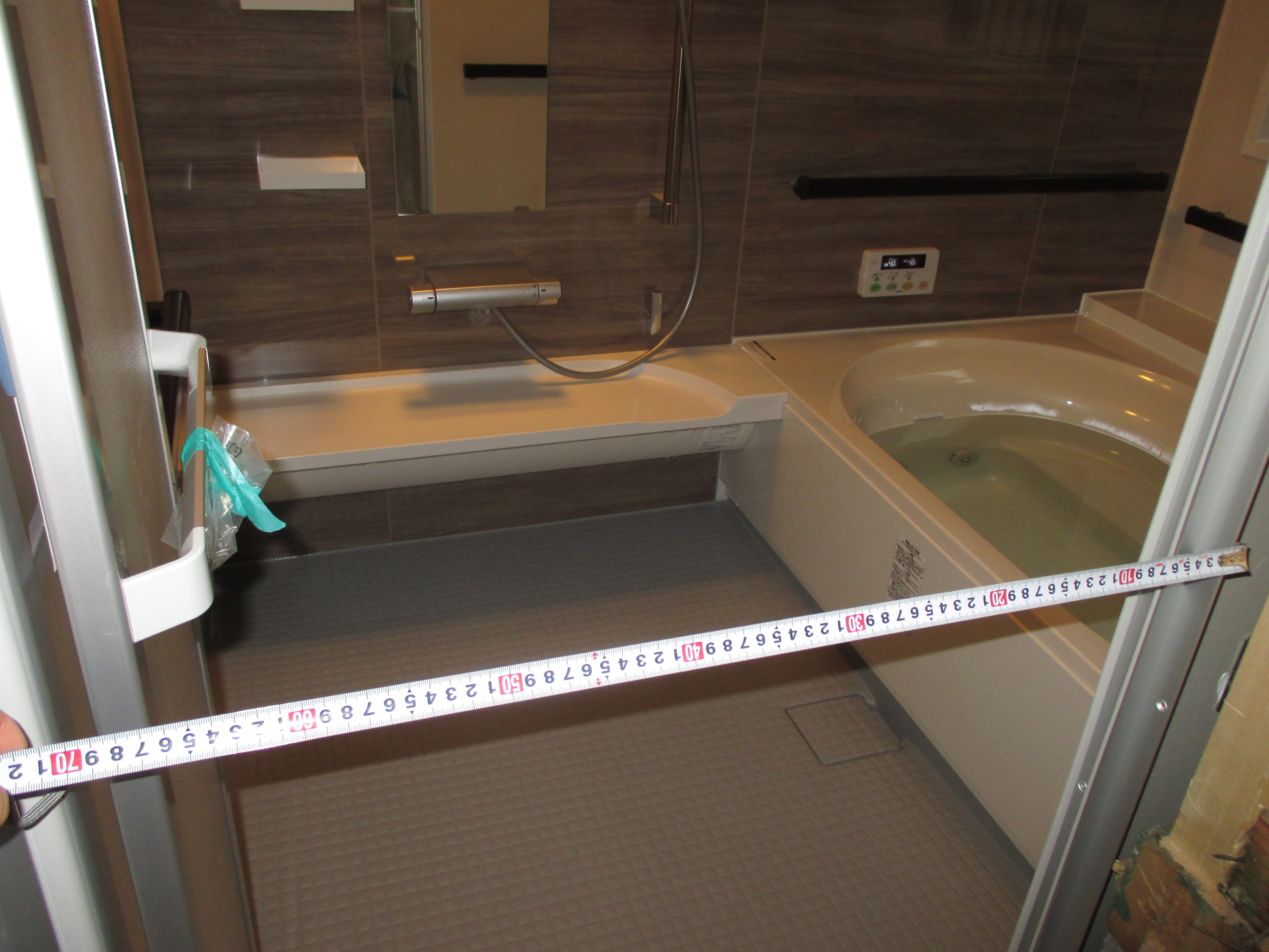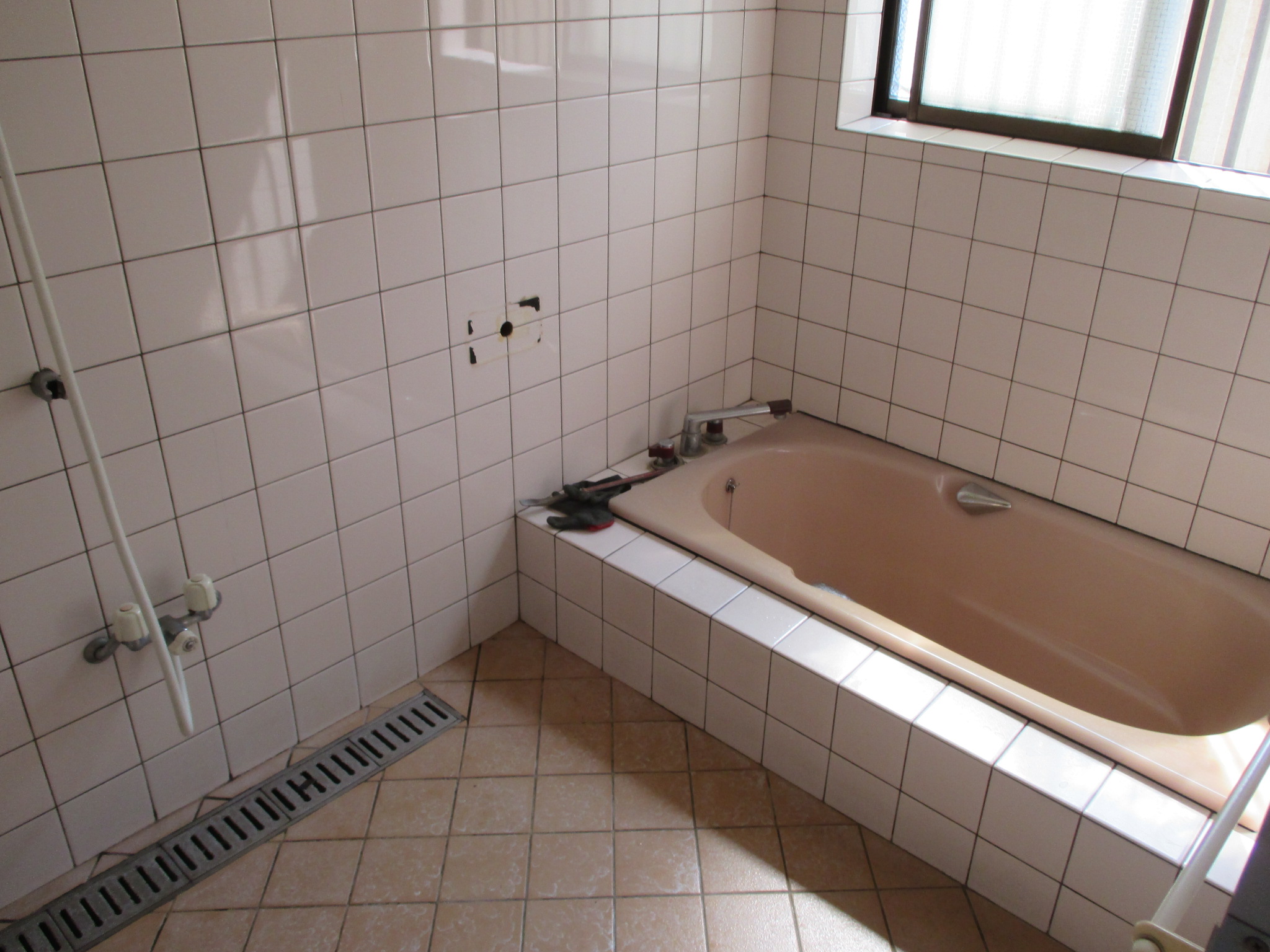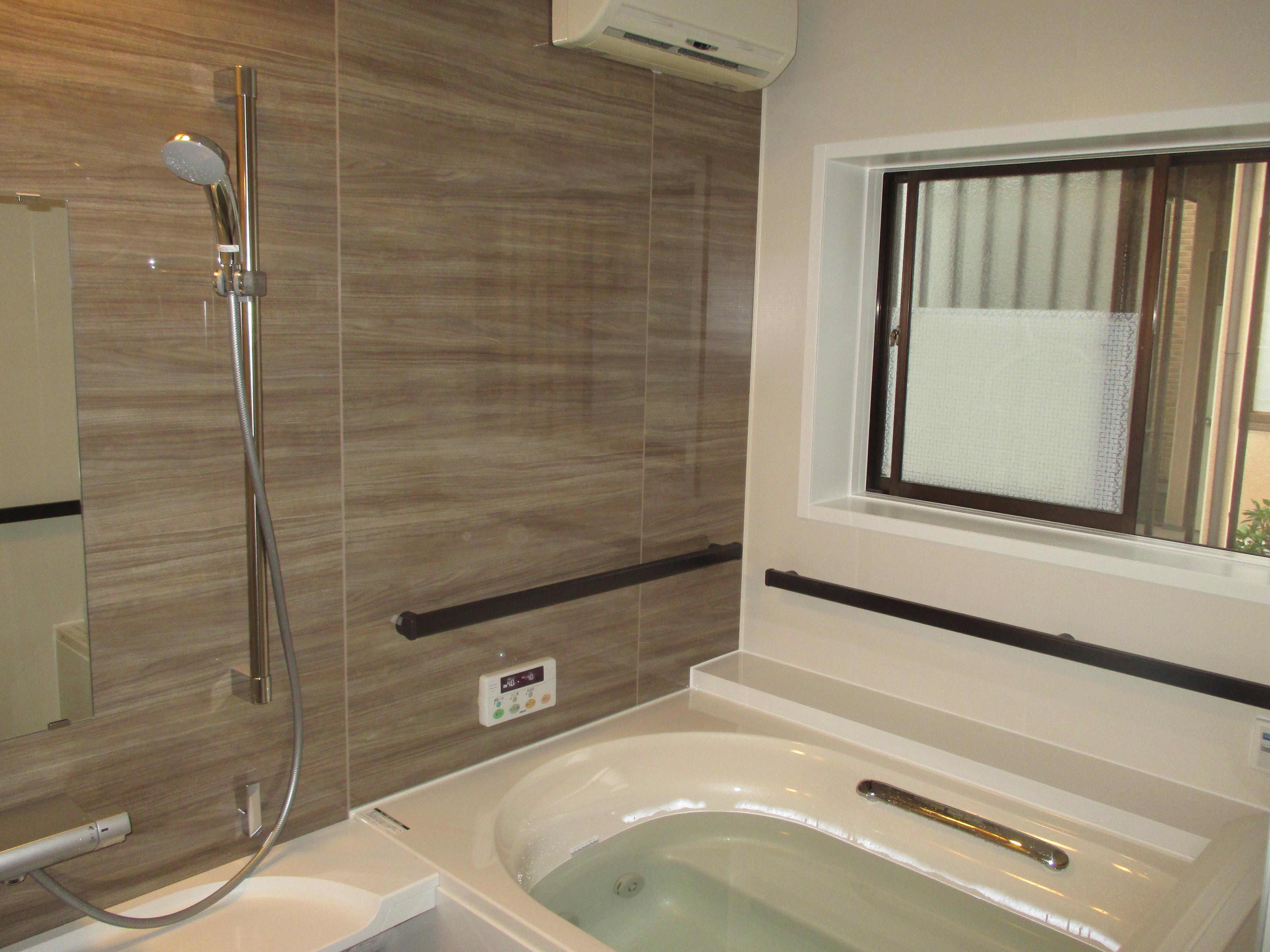 タイルのお風呂から、ユニットバスへの交換です。浴室の大きさが1624サイズという呼称の広いユニットバスになります。サポートバー手摺も4方向に設置していますので、浴槽に入る時に便利です。アクアジェット4方向付なので疲れた時はリフレッシュ☆