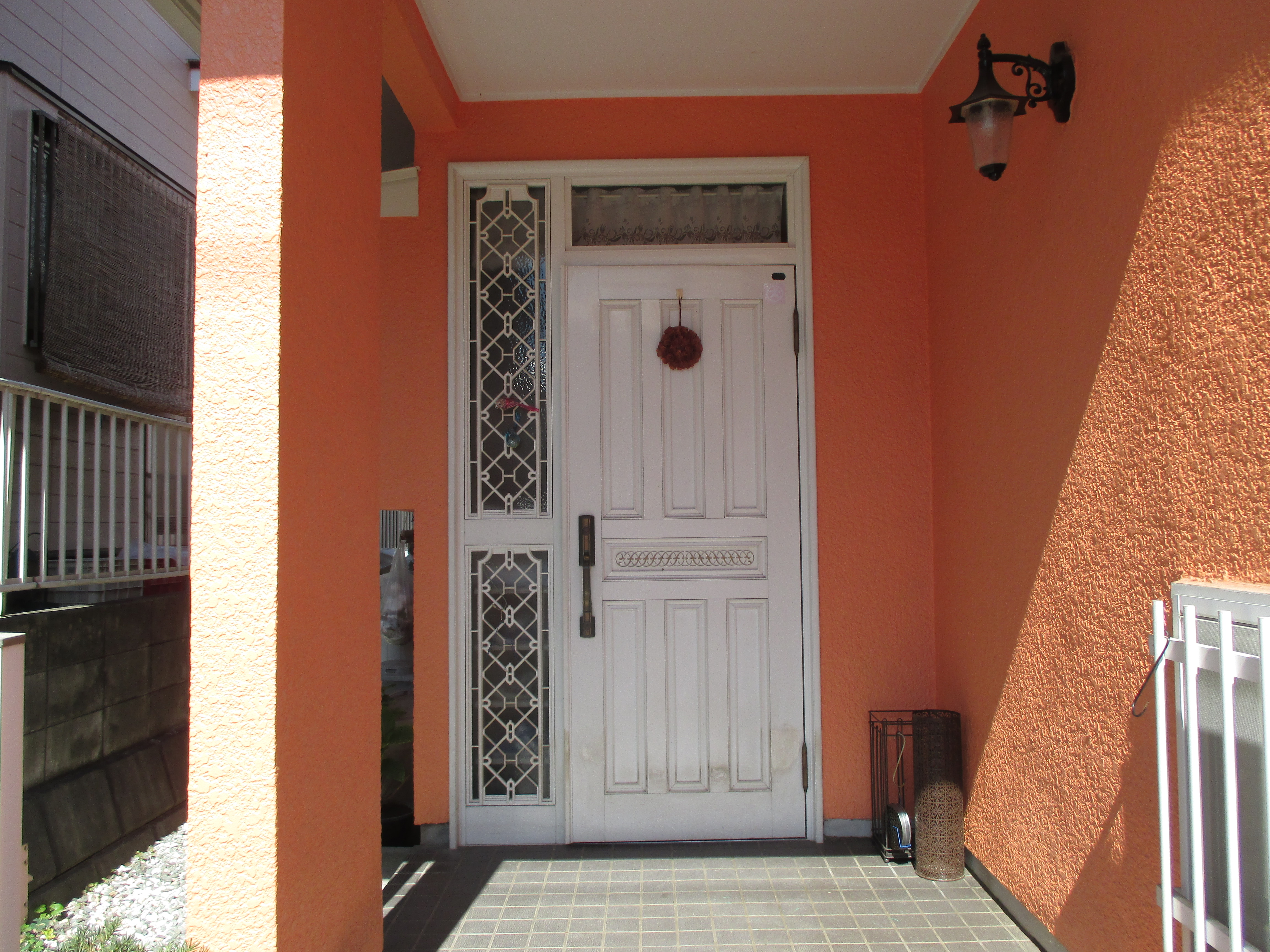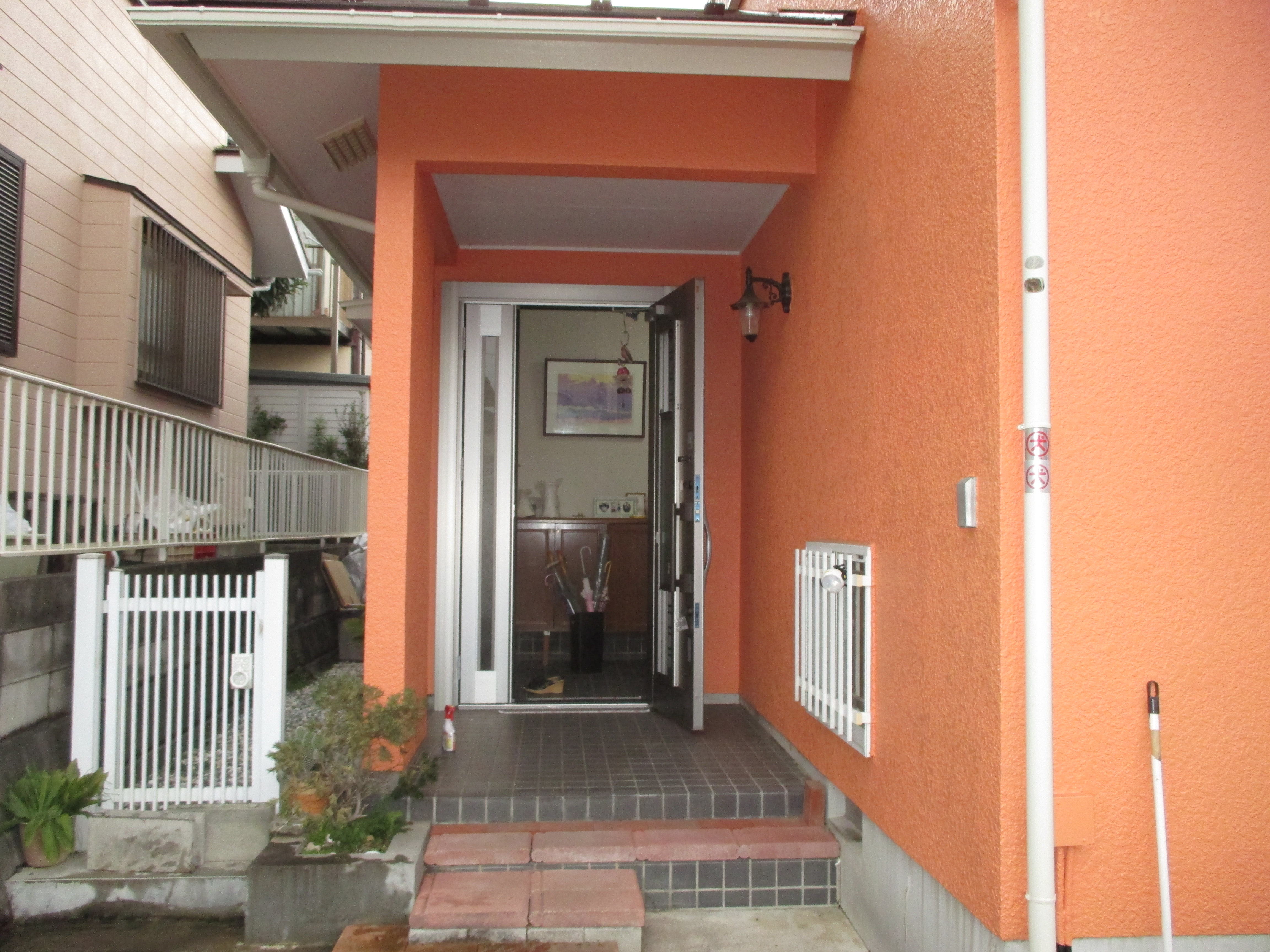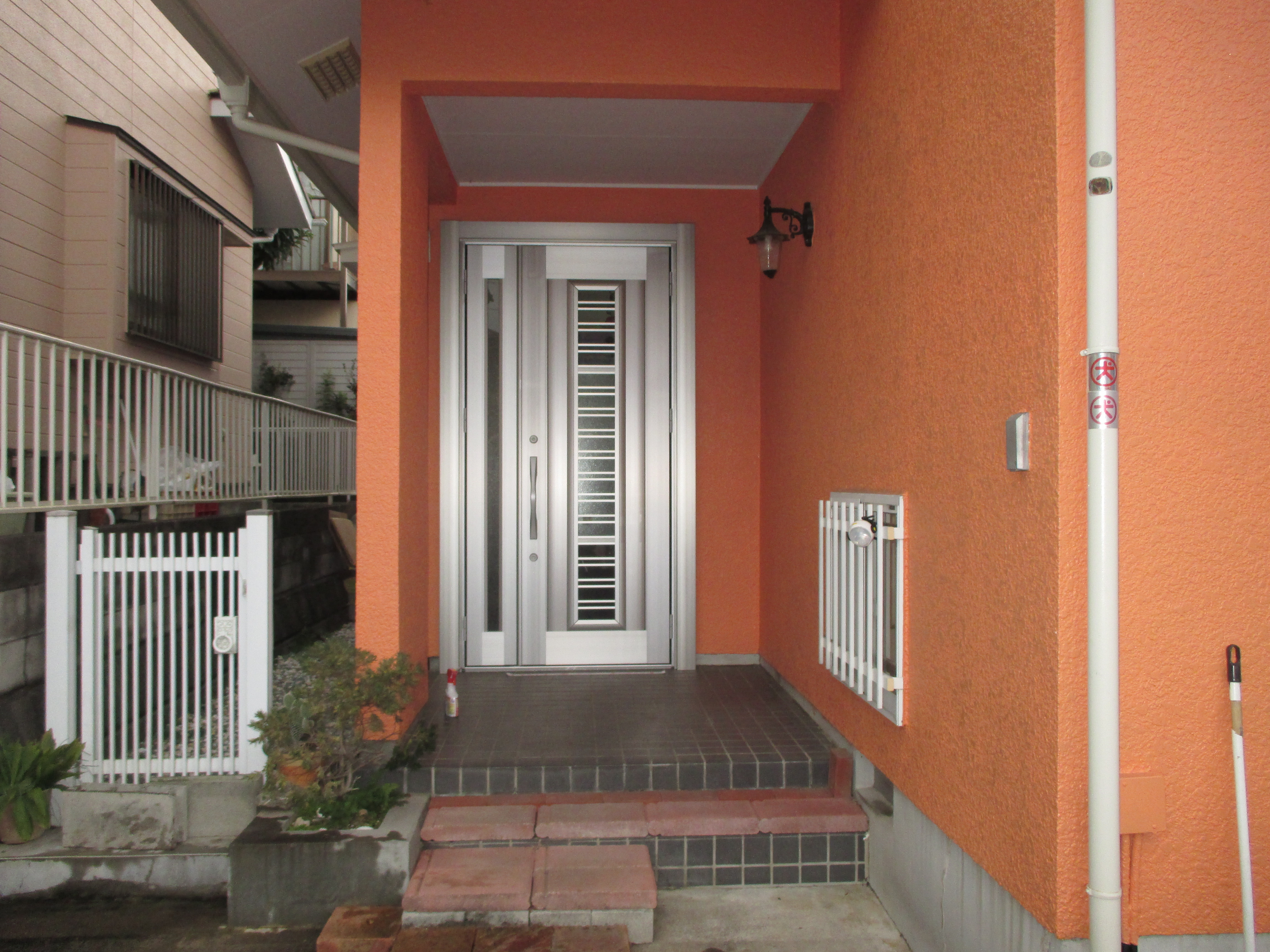 リフォーム玄関ドアの工事です。外壁、タイルなどを解体せずに、一日で新しい玄関ドアに交換できます。採風タイプのドアなので施錠したまま、換気できます。