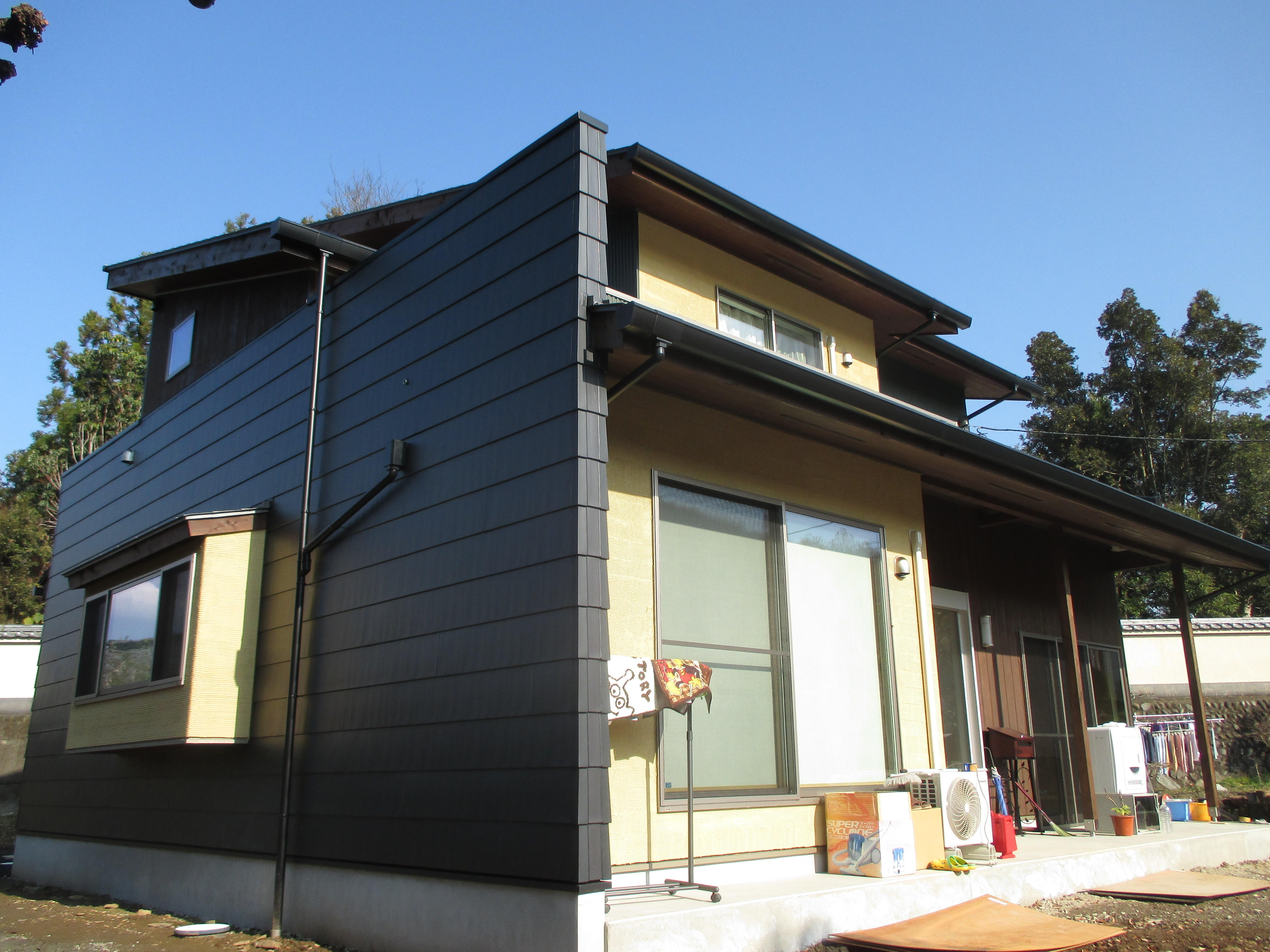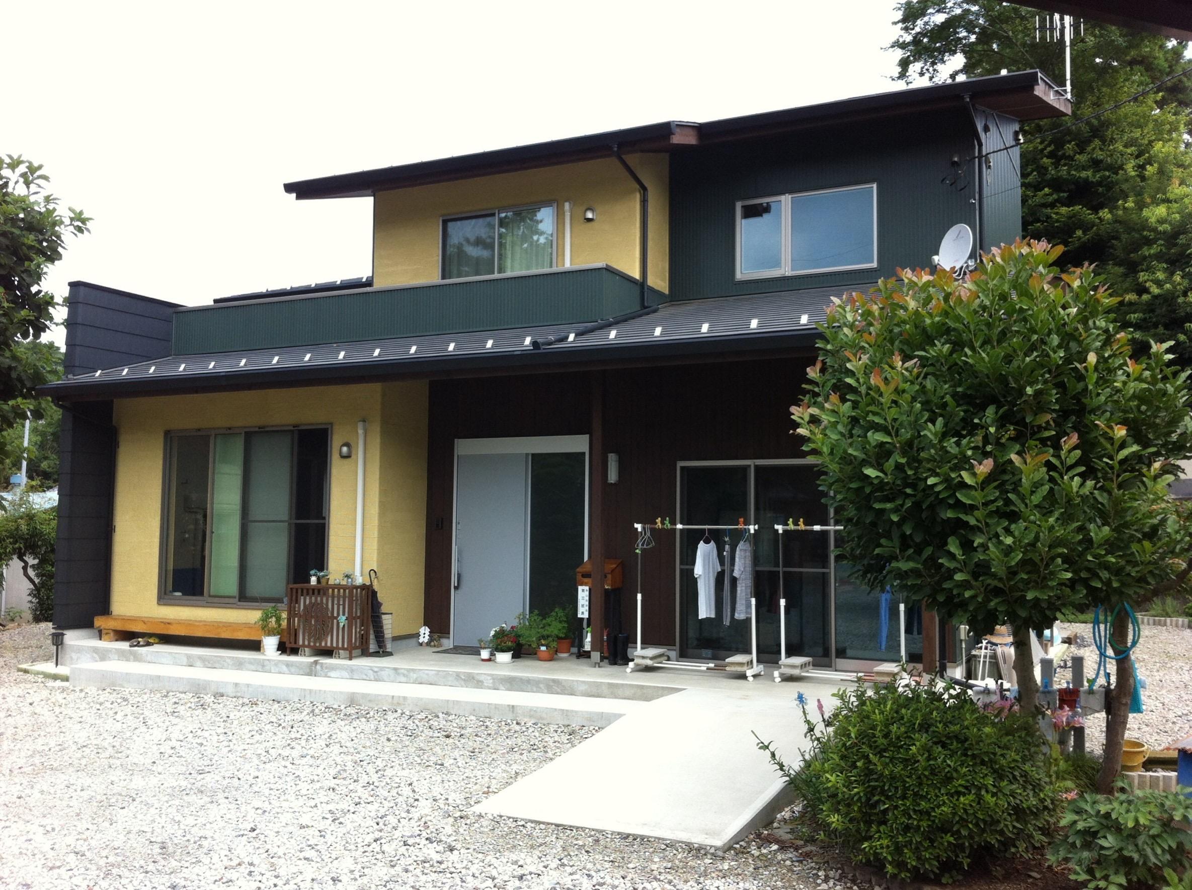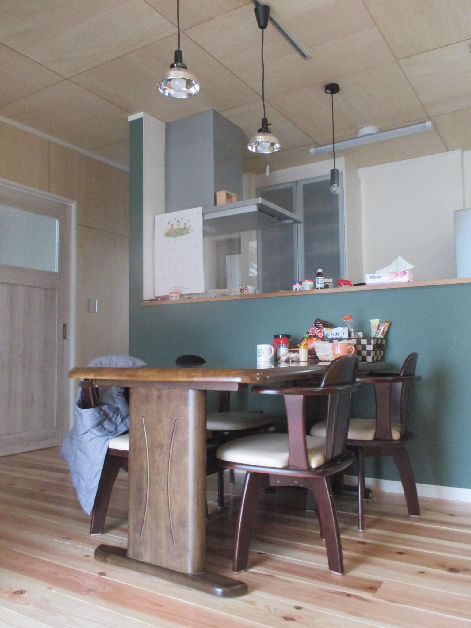リビングです。床は無垢の杉、天井はシナベニアで仕上げました。キッチンはLIXILリシェルを設置し造作対面のカウンターを設けました。カウンター側はアクセントクロスで、木の風合いの中に明るい青色クロスを使用し明るさを強調しました。