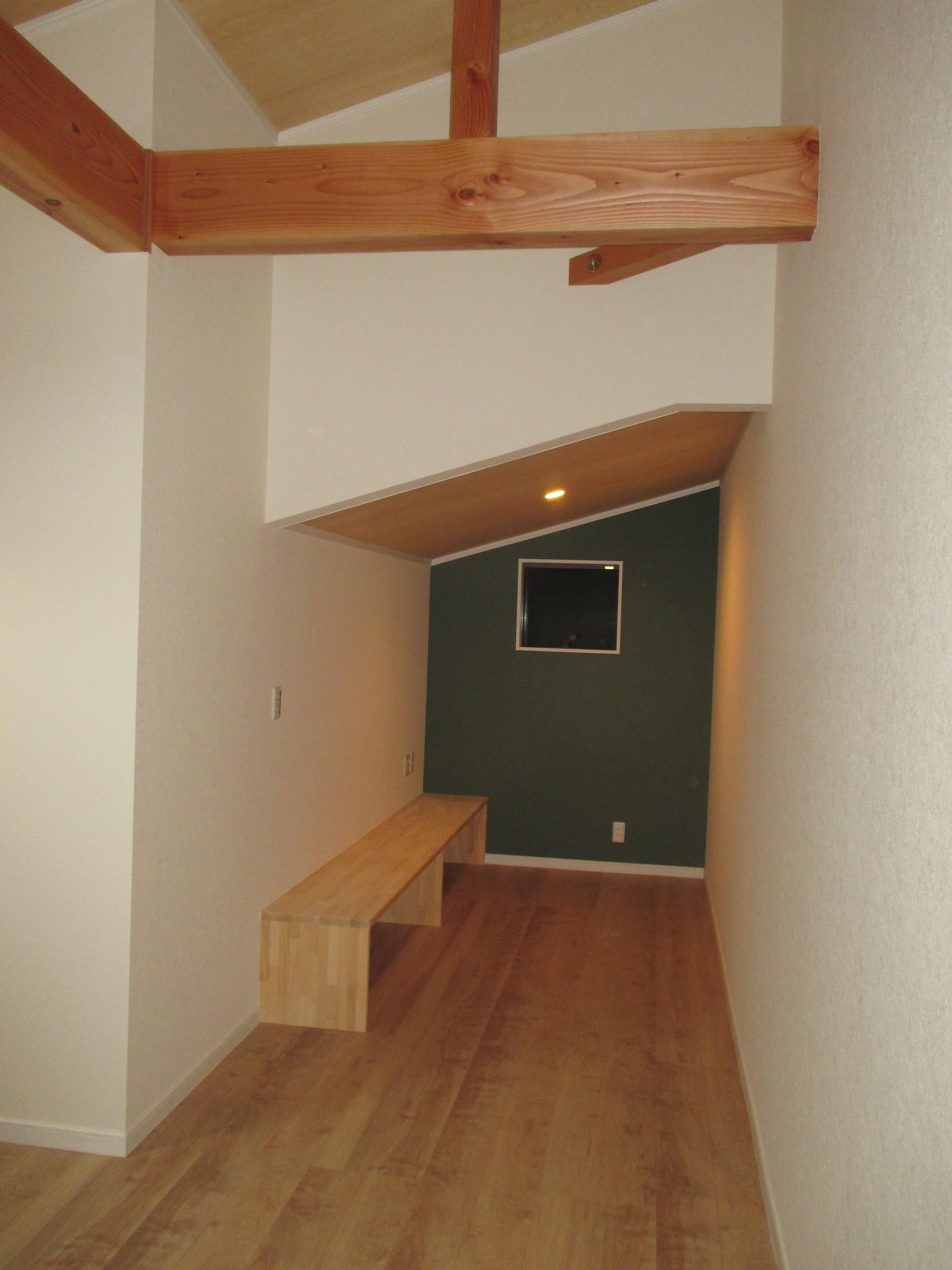 2階の書斎です。正面アクセントクロスの色は一階のキッチン造作対面のクロス色と同色にしました。