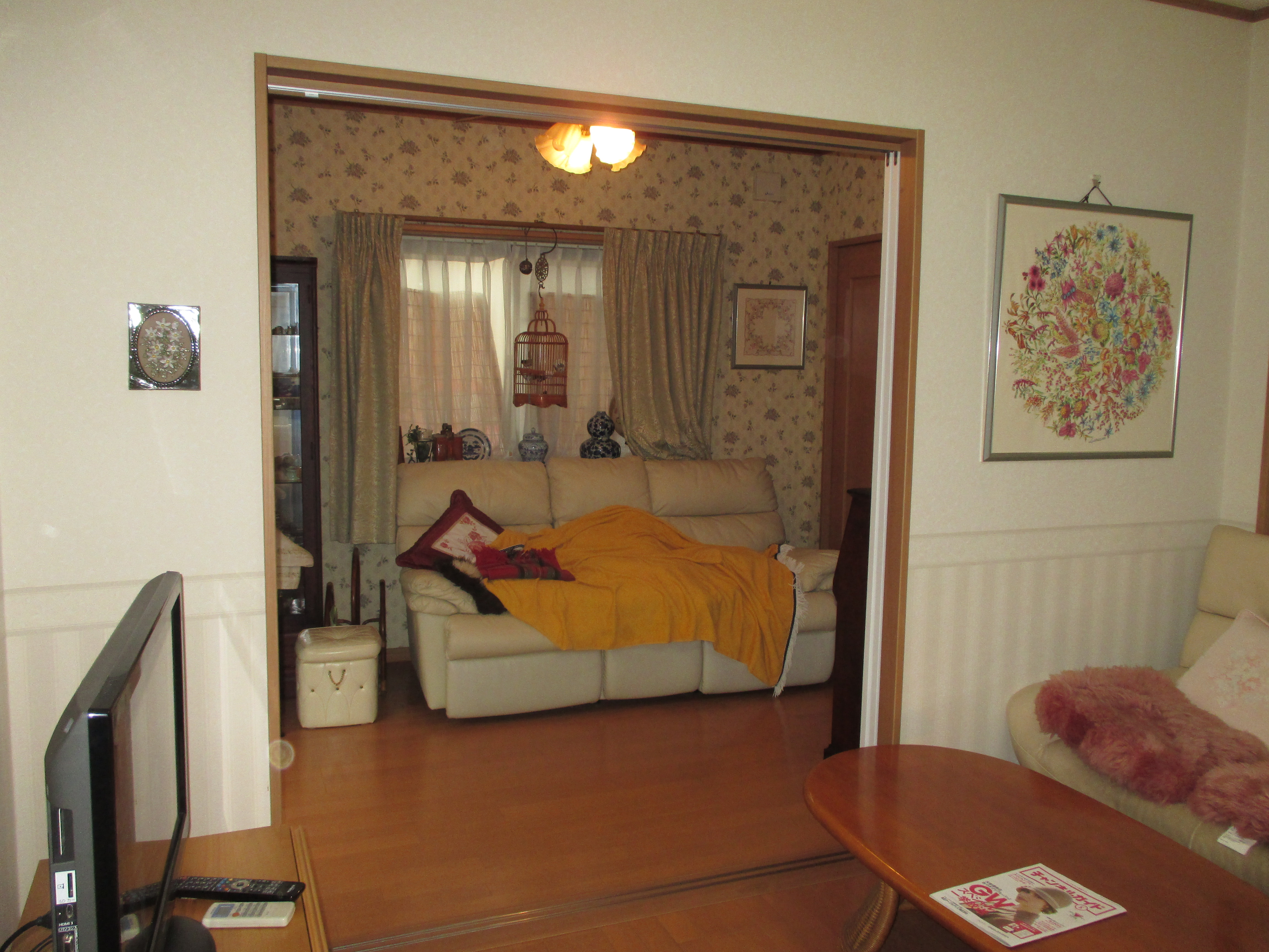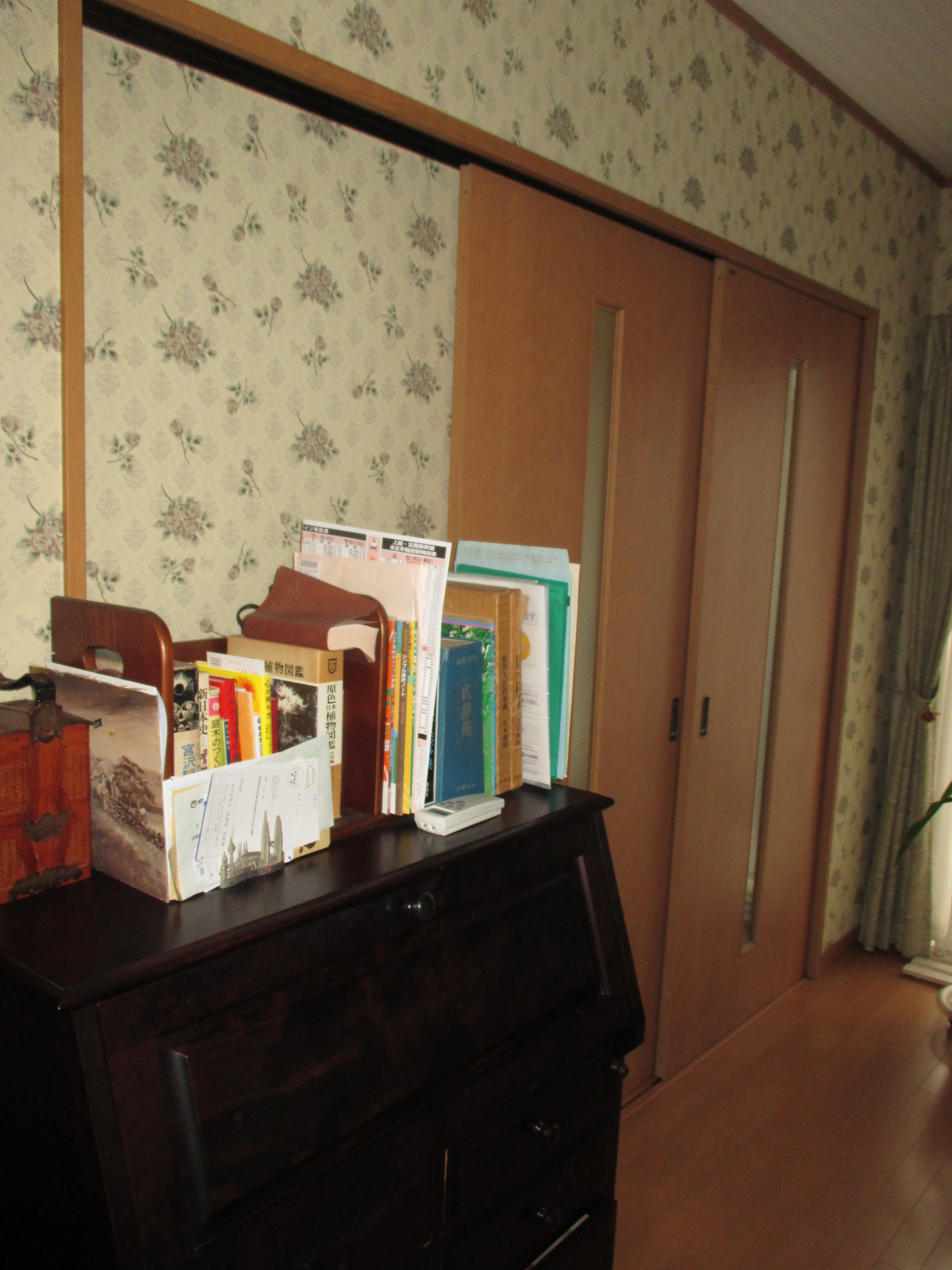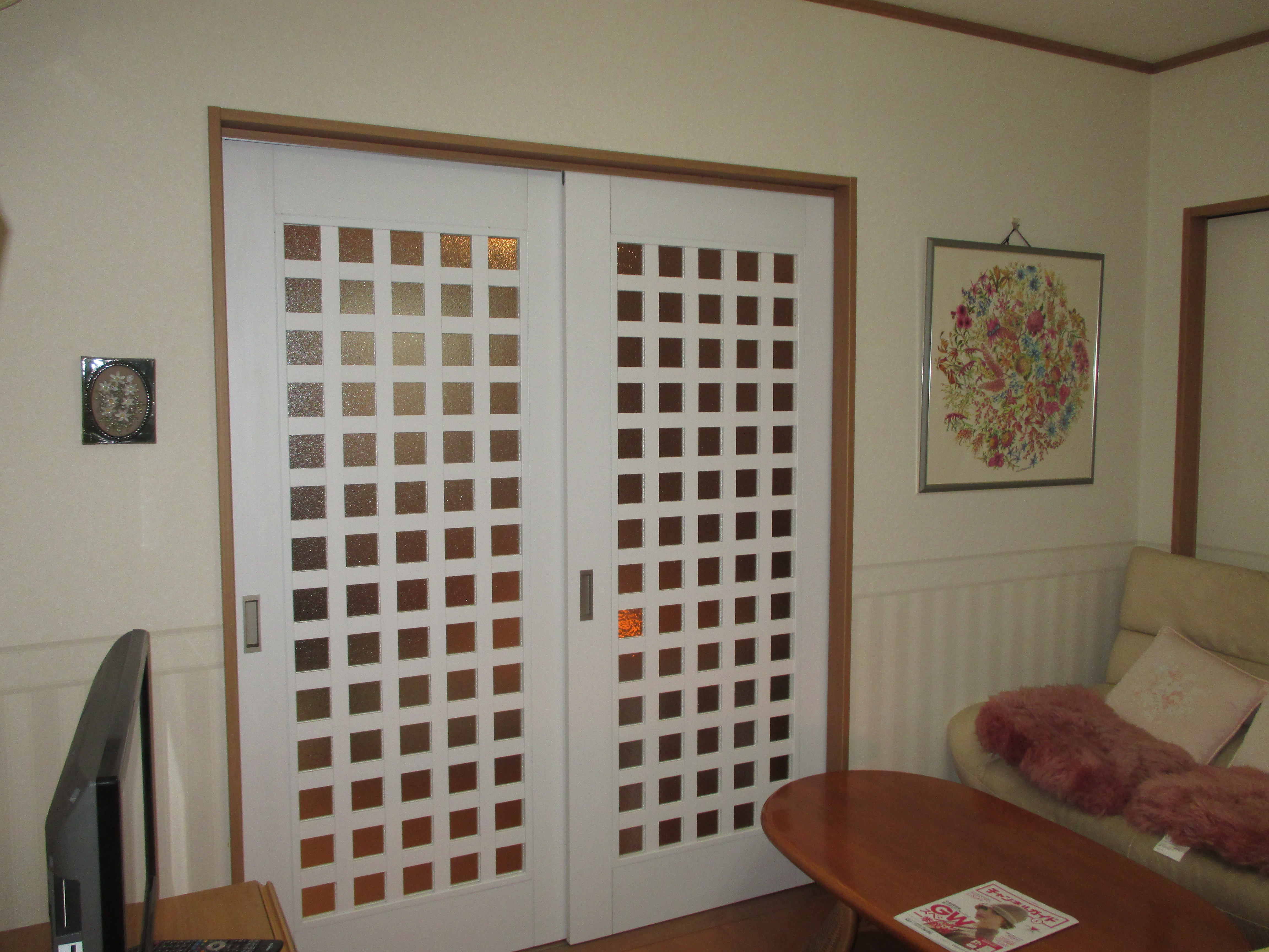 内装の建具を交換しました。2枚建て片引戸なのでフルオープンになる建具です。既存の枠と建具が合わないので、枠、レール共交換してます。枠は木色で建具はホワイトで取付ました。