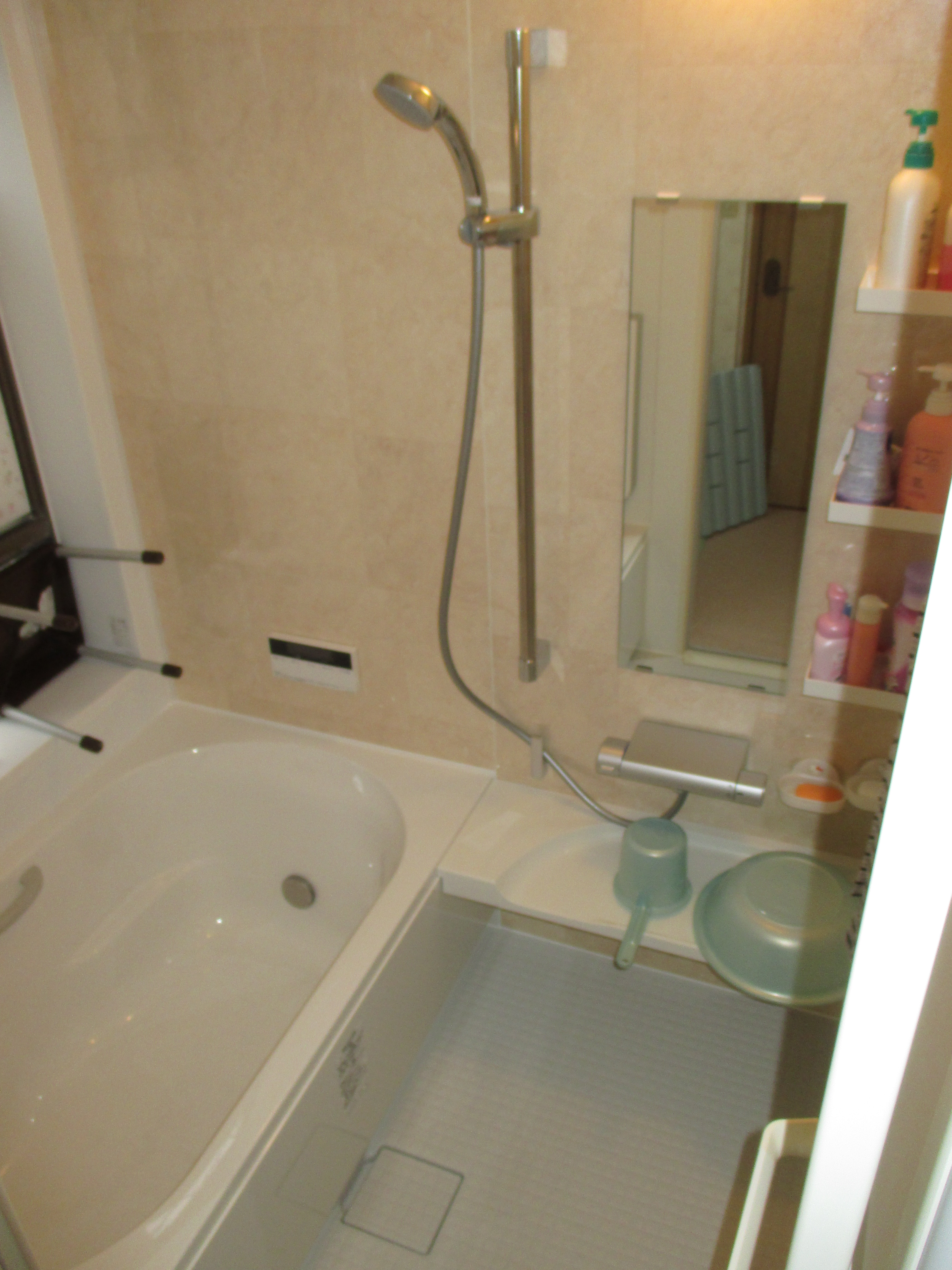 冷たいタイル浴室を0.75坪サイズのユニットバスに交換しました。古いお風呂を解体後、基礎に土間コンクリート打設し,土台の補強と防蟻処理も施しました。少ないガスで効率良くお湯を沸かす給湯器で省エネに。