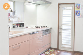 キッチンは、広さこそ変わっていないものの、最新のシステムキッチンを導入したことで、収納性と使い勝手がアップ。上段の収納には、圧迫感を感じさせないホワイトを…下段の収納には暖かみのあるピンクで、上下別々の色を選択しました。