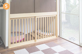 「6畳+押入れ」の和室を、6畳の洋室にチェンジ。犬用のゲージを設置し、愛犬がくつろげる空間を作りました。愛犬たちはこのゲージを気に入ったようで扉を開けておくと自分から入っていきます。ゲージの上部は収納として有効活用できます。