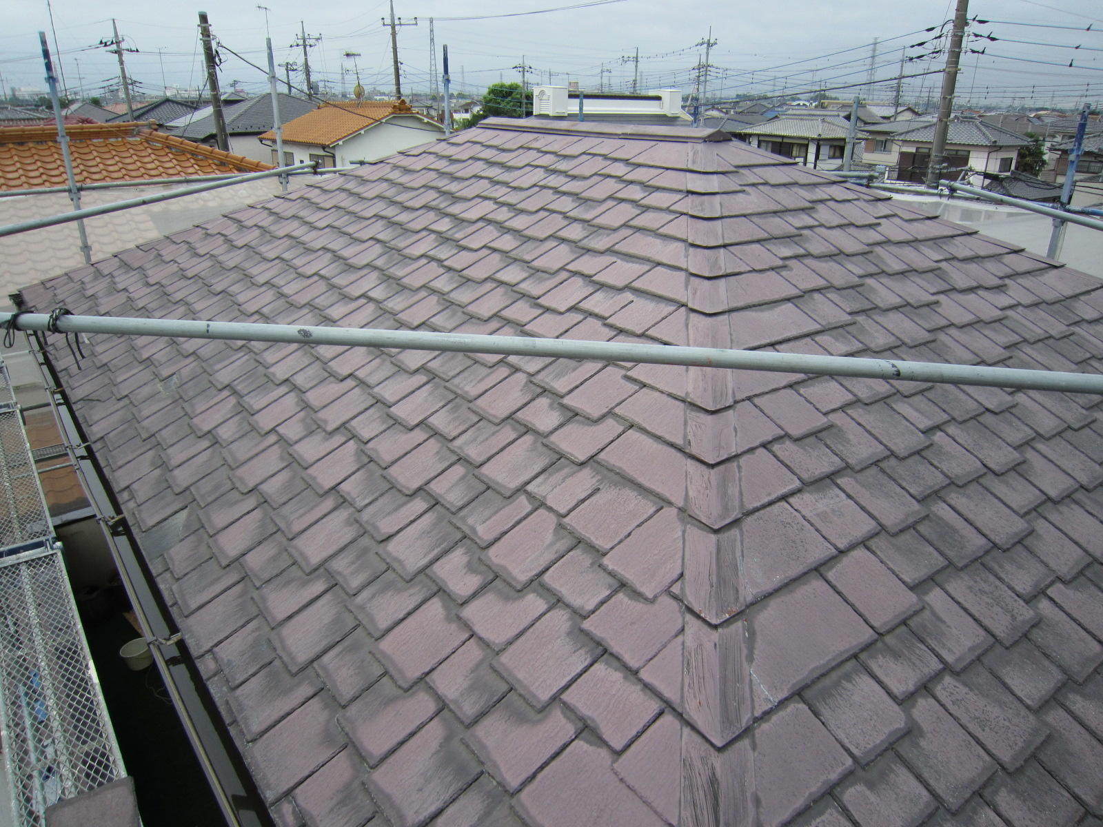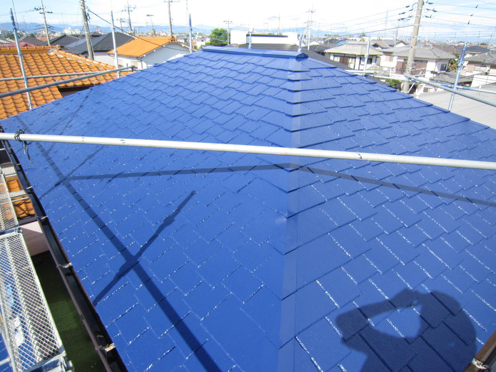 塗装サンプルをもとに屋根はサンプルの中から、外壁は調合特注で塗りました。外壁塗料は明るめと濃いめの2パターン用意させて頂き濃色で施工しましたが、施工後日当たり具合で明るく見えるので濃色にしてよかったと思います。屋根も青系濃色でみましたが、やはり日当たり具合で明るく見えます。塗装サンプルよりも明るく見えてしまいイメージとズレが生じてしまいましたが、綺麗になり喜んで頂けました。