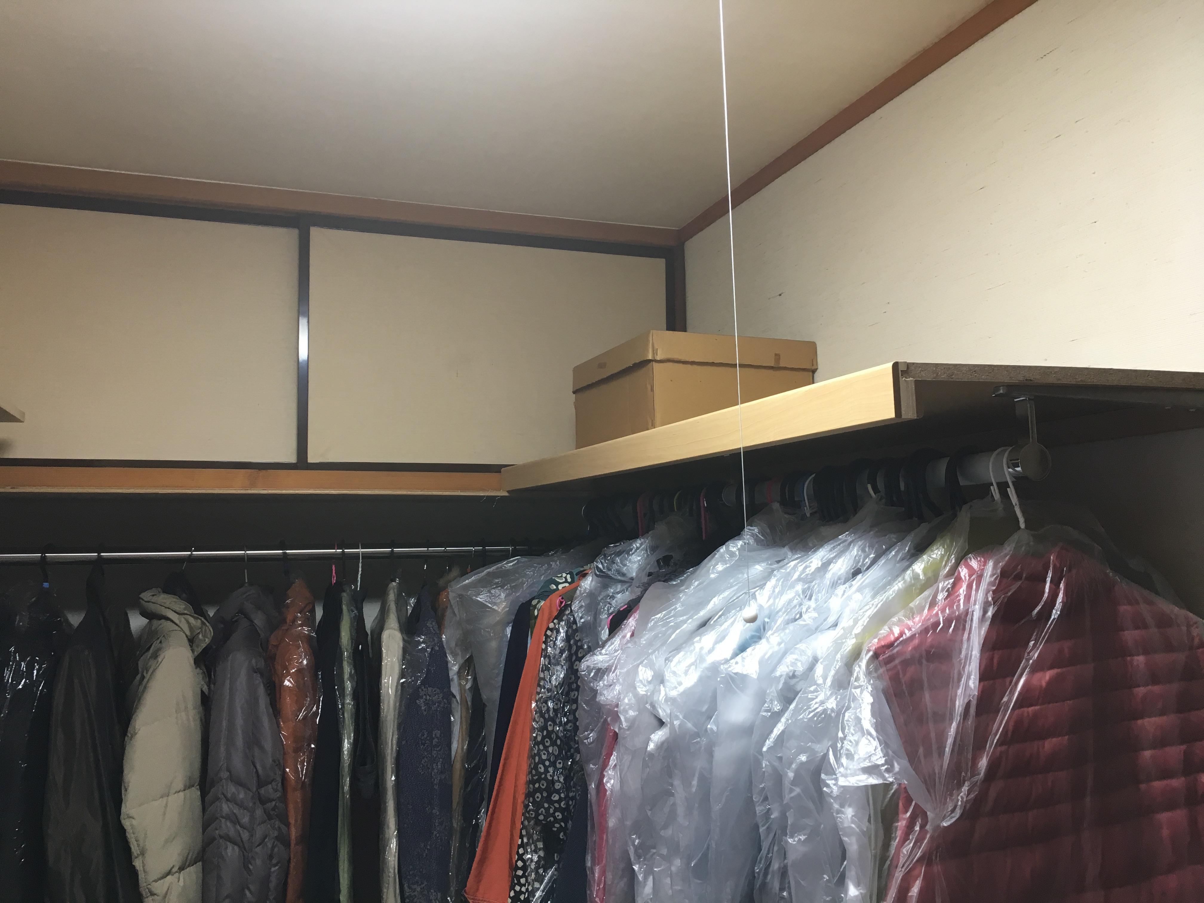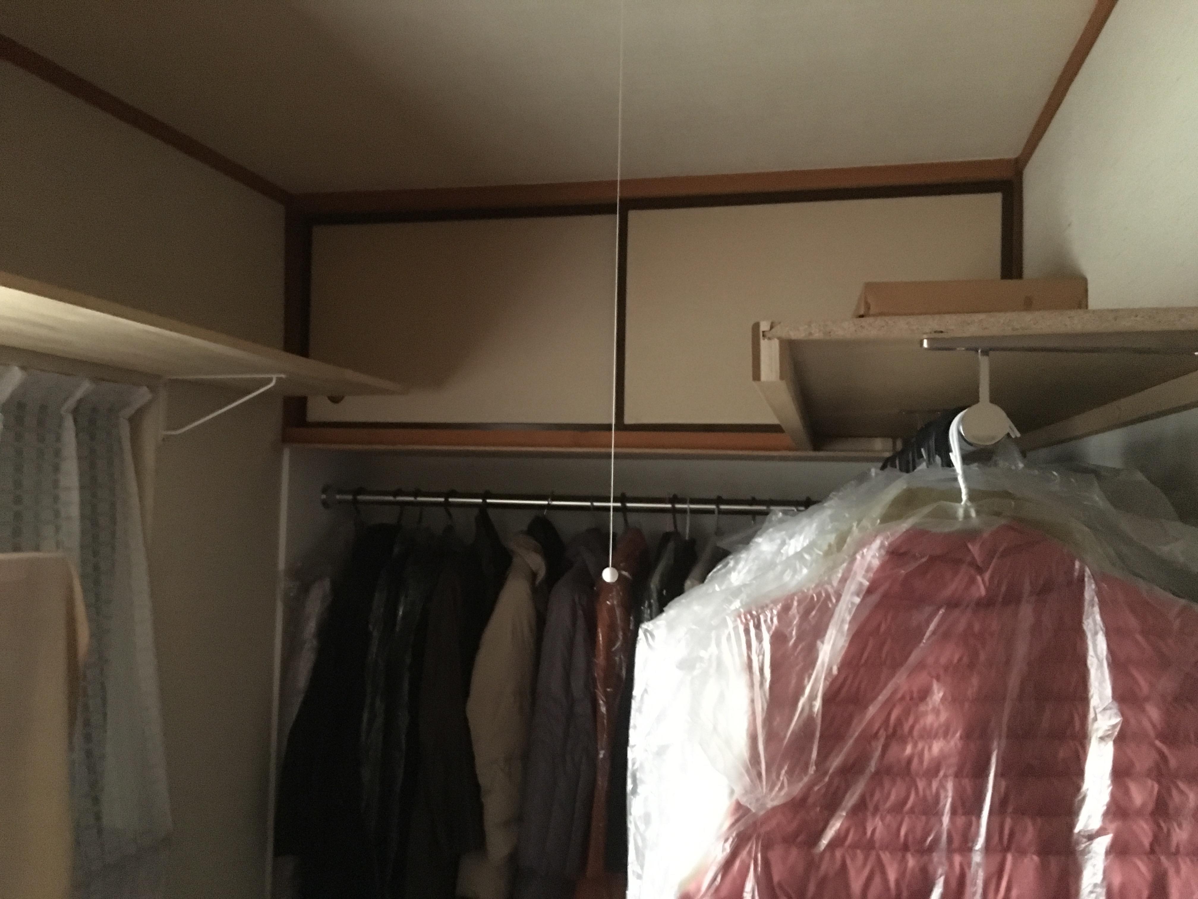 タンスを撤去した空間にハンガーパイプを設けるため12㎜の下地材を貼りました。下地材のままでは不格好なのでカッティングシートを張りアレンジ。きれいに仕上がりつつもハンガーをかける部分も増え、棚も増え収納が多くなりました。