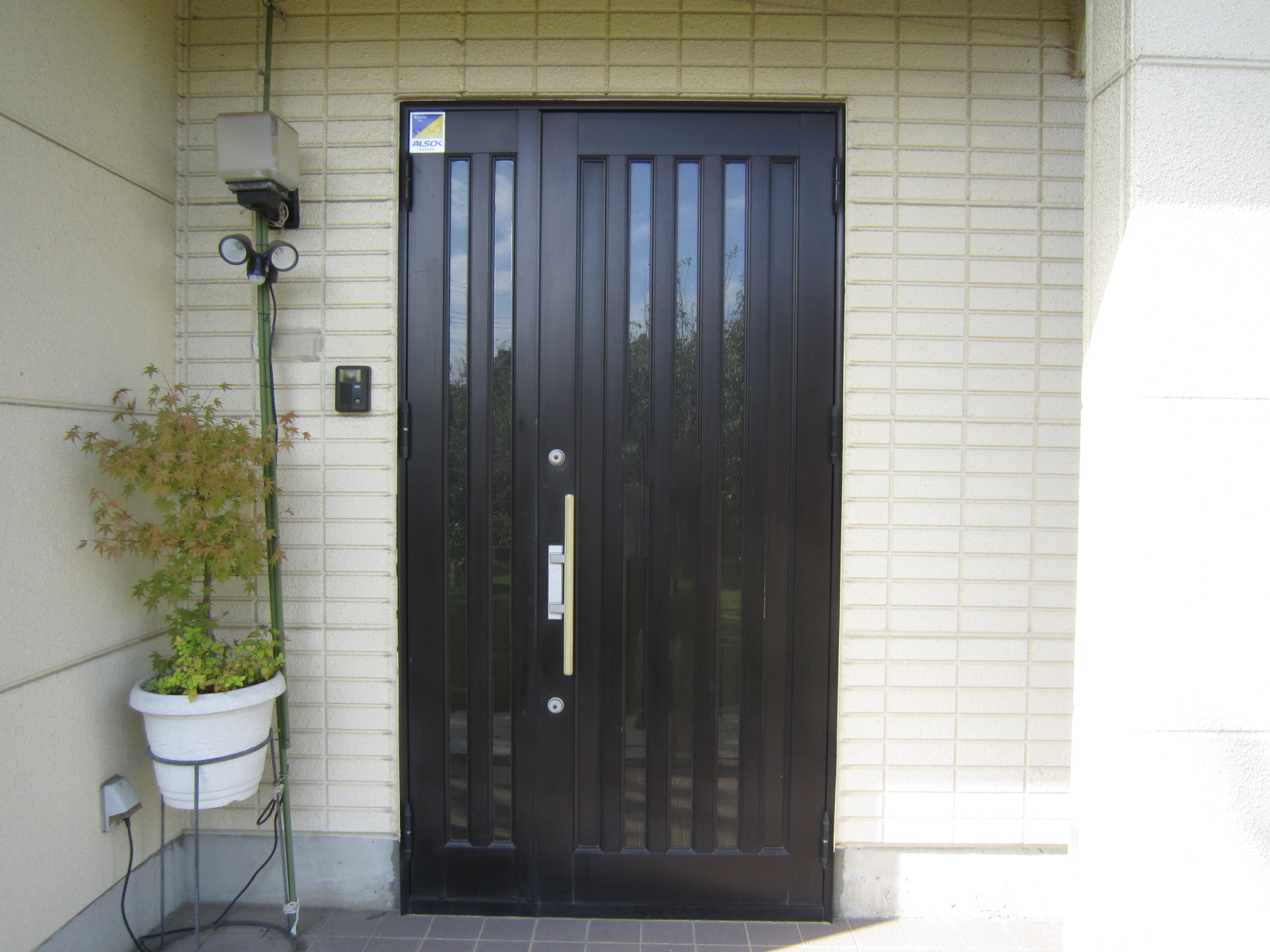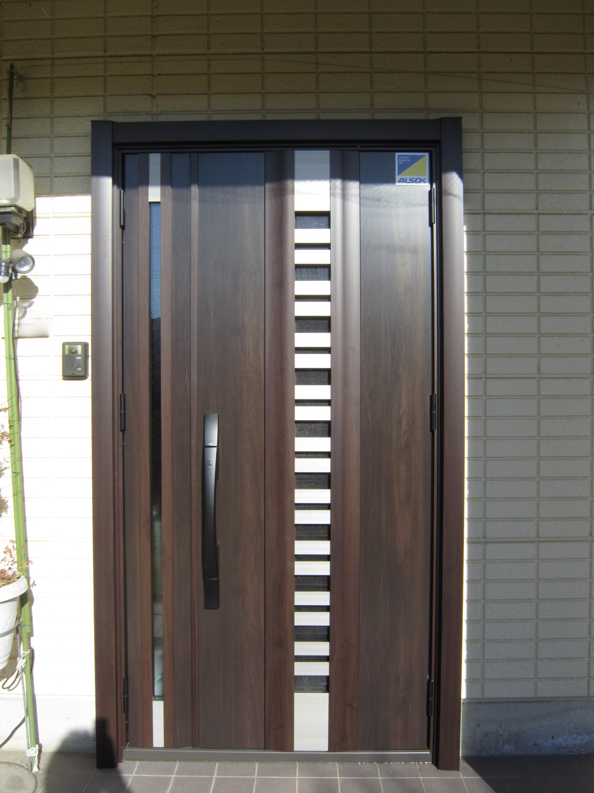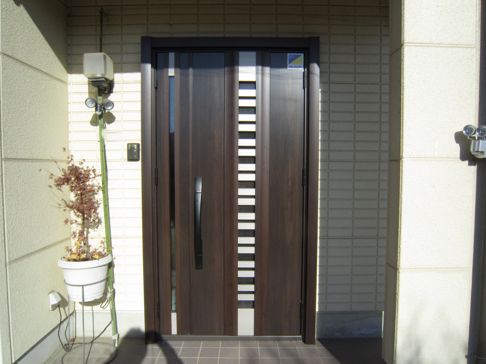 御客様の御希望デザインを決めて頂き、最終でのカラー決定を外壁との色合いで判断してアドバイスさせて頂きました。 従来のドアがアルミ系であり、外壁が淡色塗装の為、ドアの色を木目調の濃色にさせて頂きました。 濃色も一番濃い色ではないので日当たりで木目が綺麗に見え、外壁との取り合いでは色を強調させてくれました。