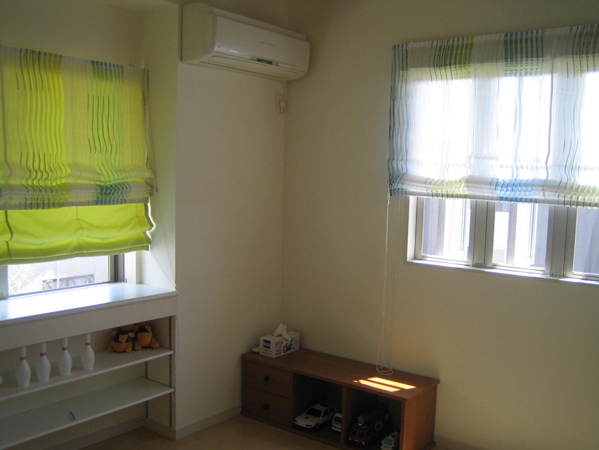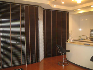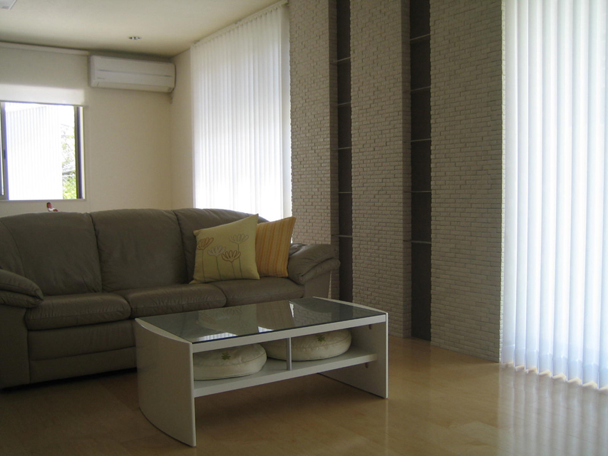 カーテンをはじめウィンドートリートメントの施工例です。明るくシンプルな空間にするため、不透明生地とシアーレースのコンビネーションによる縦型ブラインドを採用。すっきりとした中にもしっかりプライバシーの守れるリビングになりました。