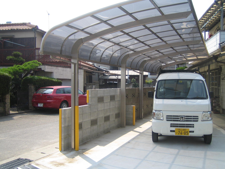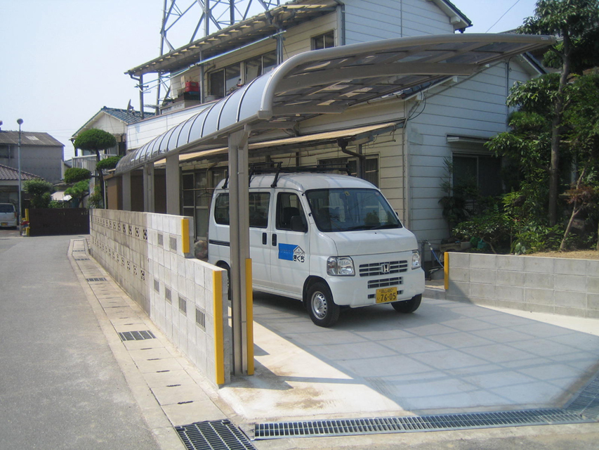 古い車庫を解体・撤去、オープンなカーポートスペースに!庭木がうっそうと茂り、居間への採光も悪かったので、思い切って伐採し、あわせてオープンスタイルのカーポートを新設しました。