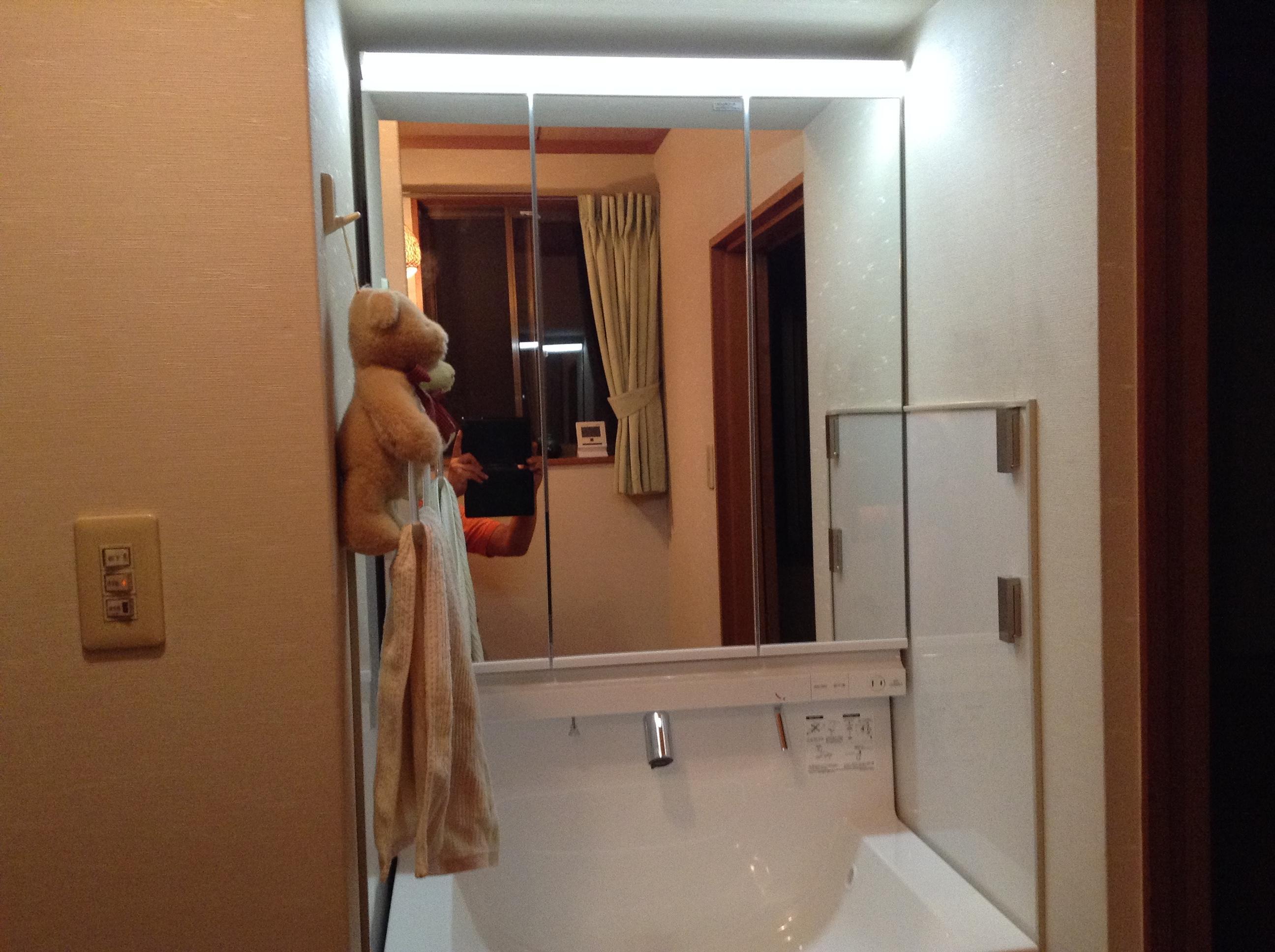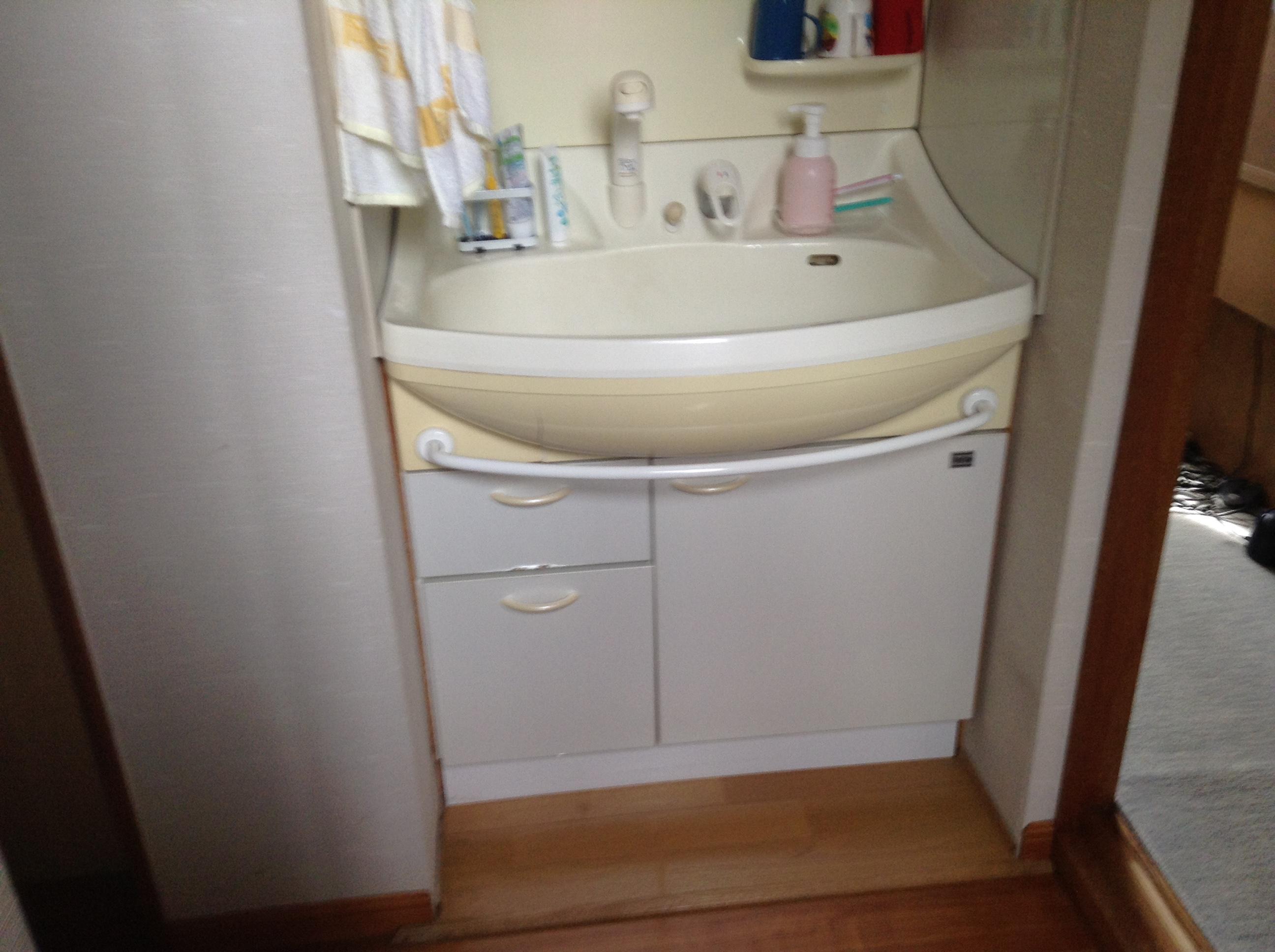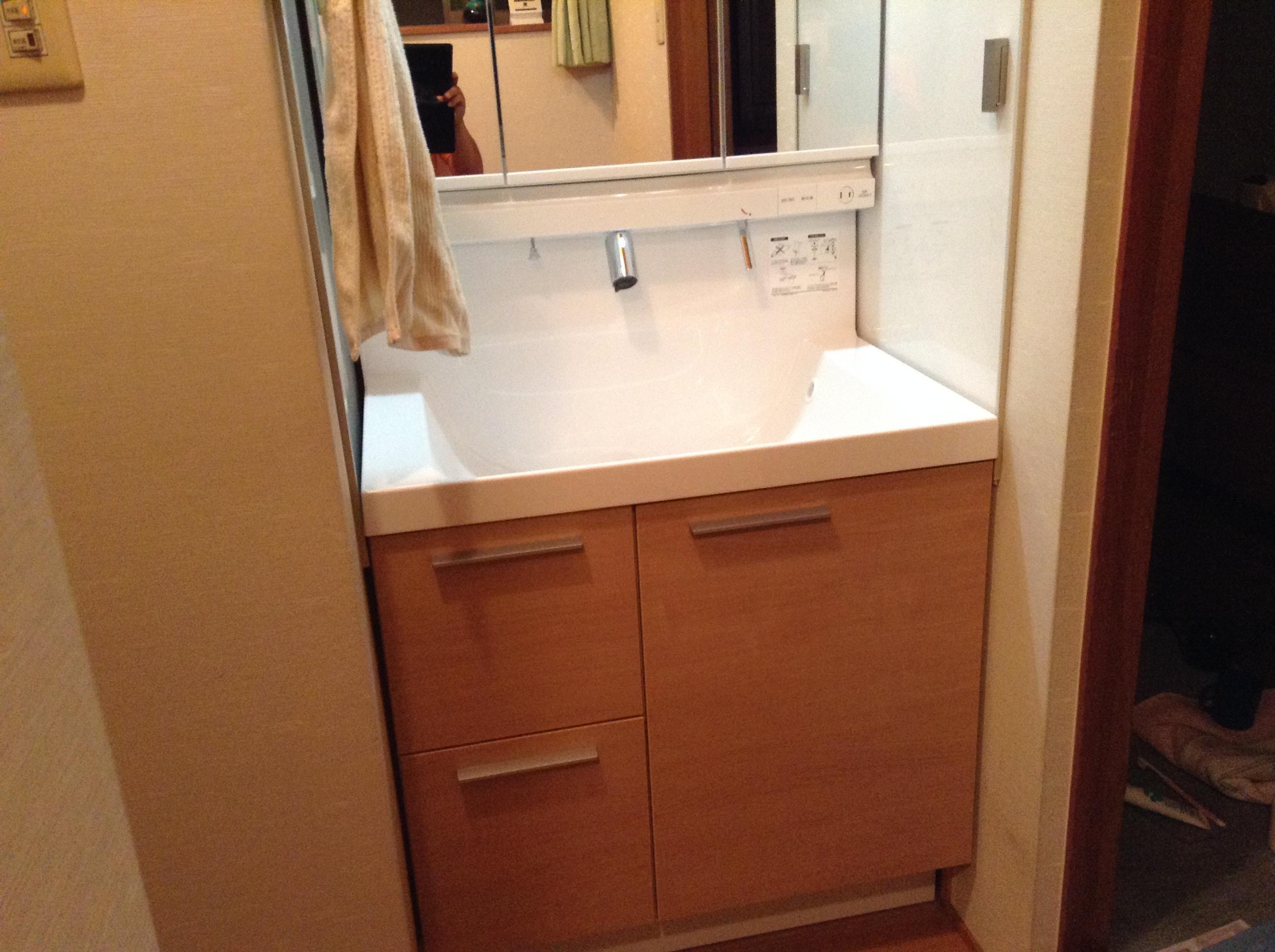 2階の階段をあがったコーナーに両側壁面設置してあった洗面化粧台取替ということで脱着作業では苦労しましたが、前のものと比べ奥行きが浅くなりスッキリした設置ができました。