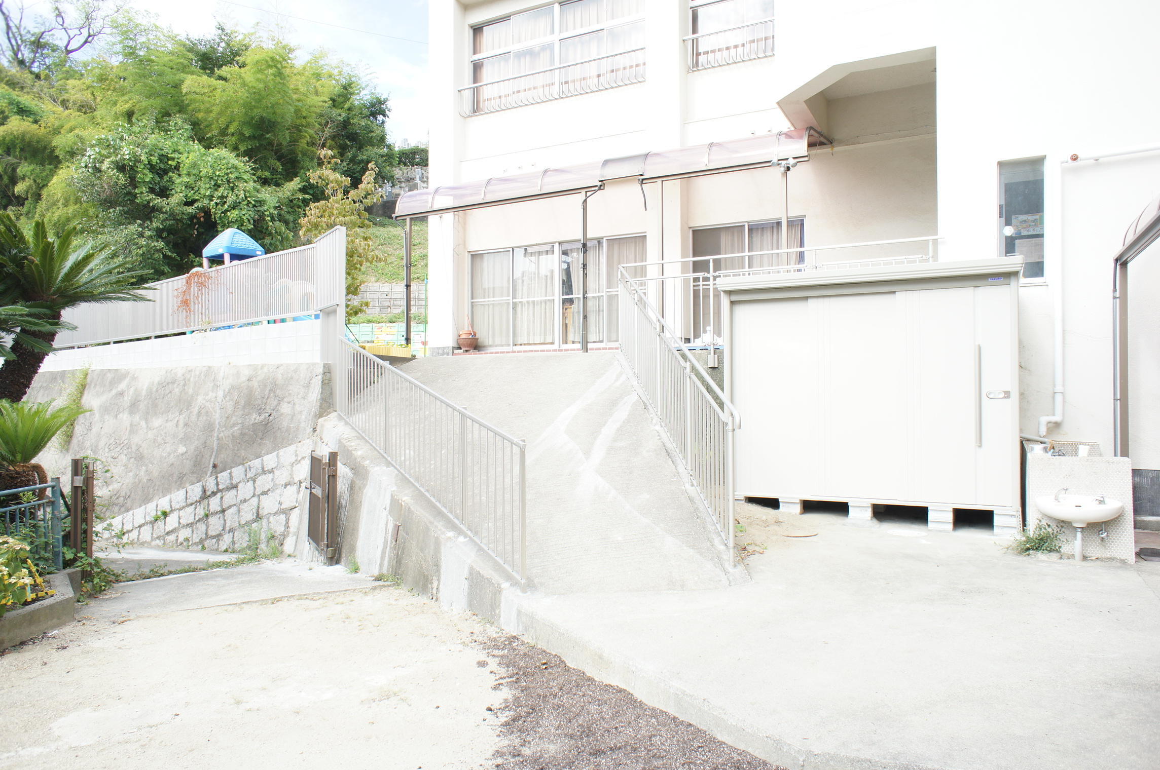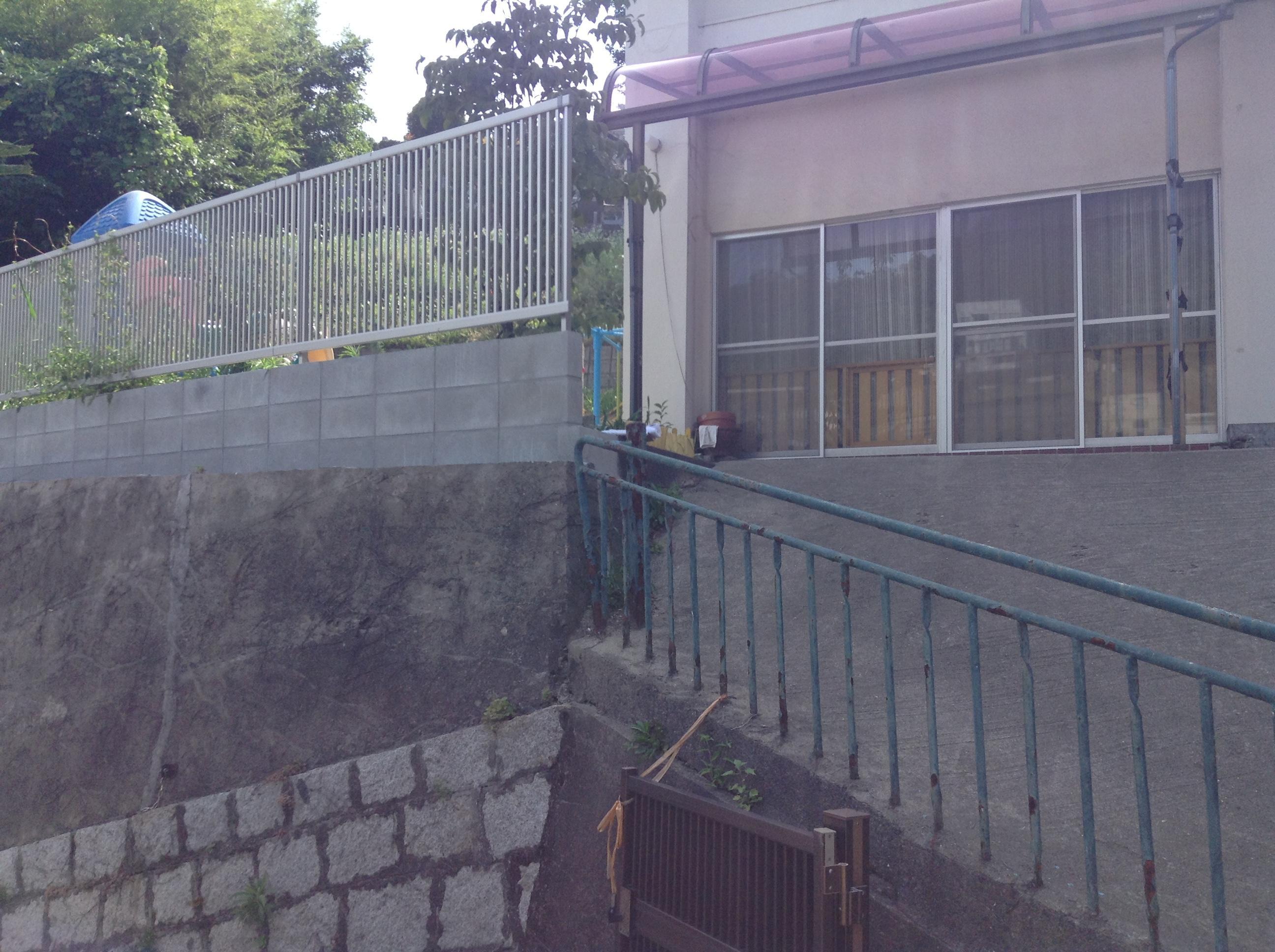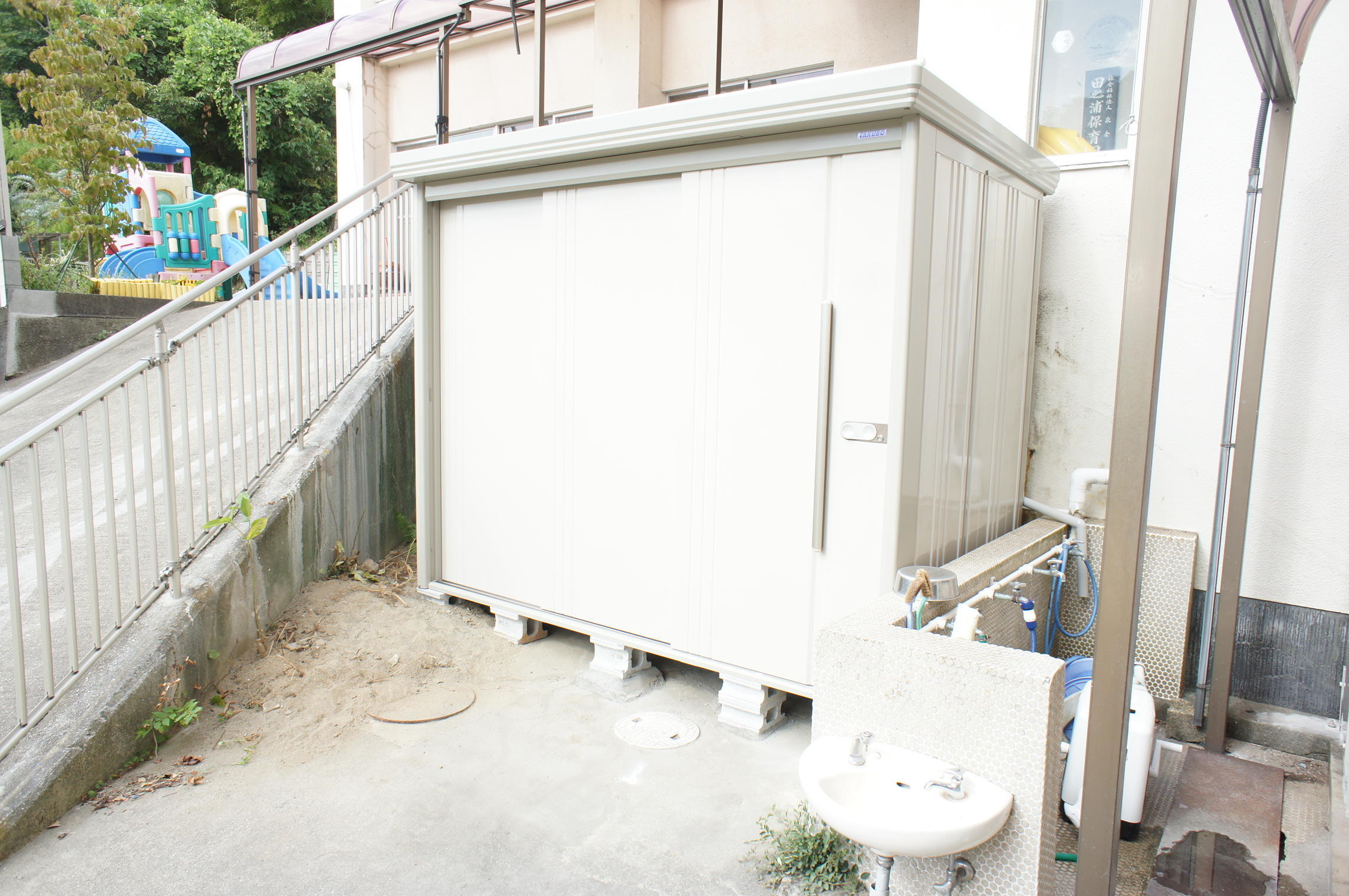 急な坂に面した外柵(スチール製)の取替を行い、あわせて物置の取替もおこないました。