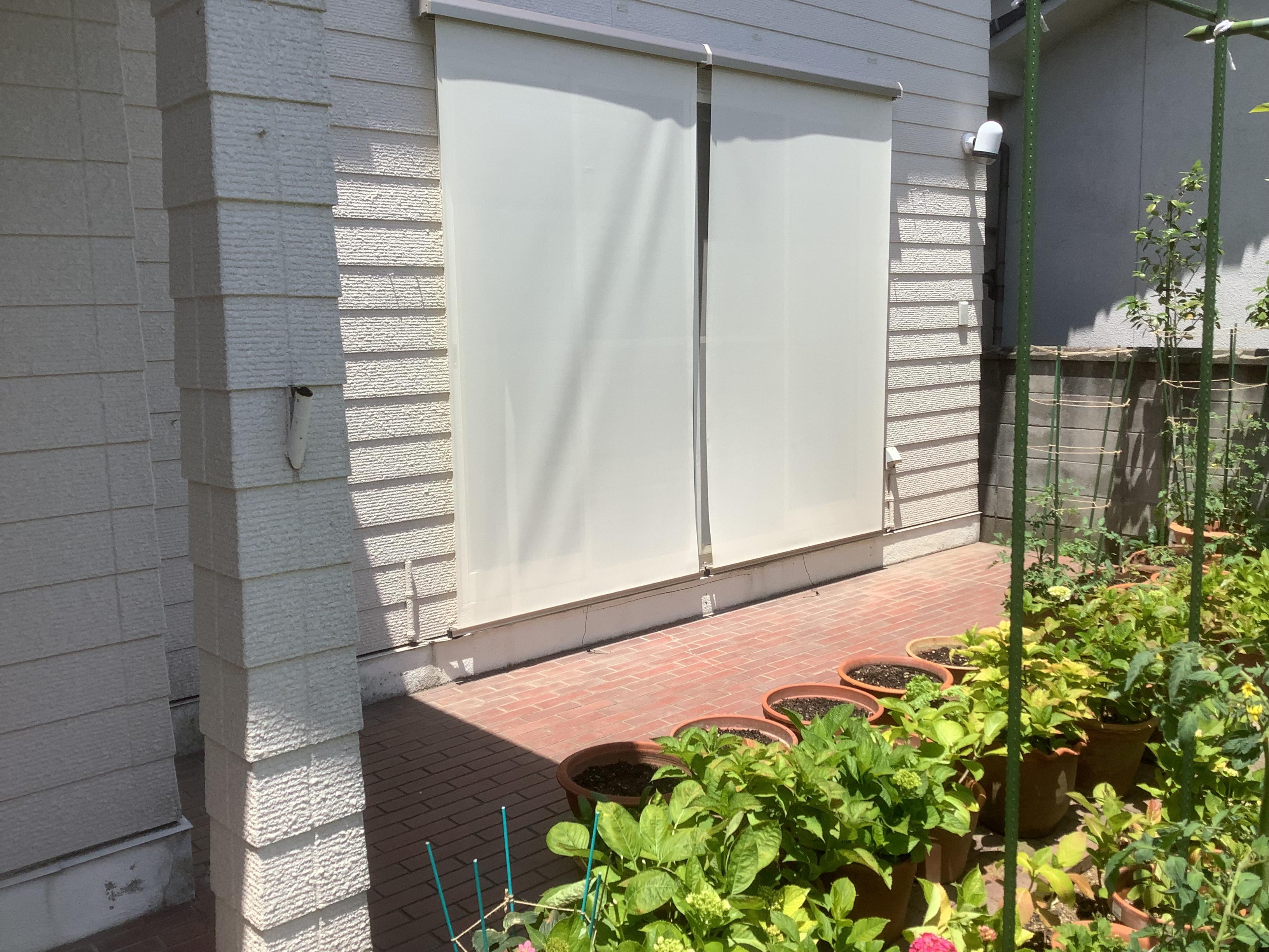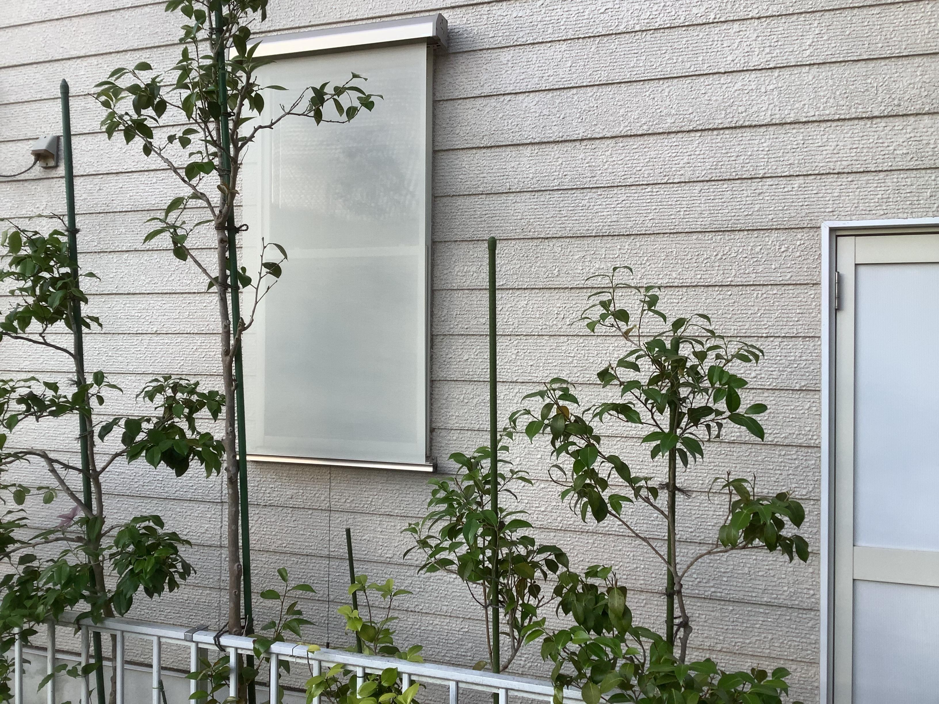 以前DIY施工で『たてす』を設置していましたが、強風で倒れたり設置に手間が掛かっていましたが、今回のロールスクリーンだとオフシーズンはヘッドボックスに収納できるので安心です。